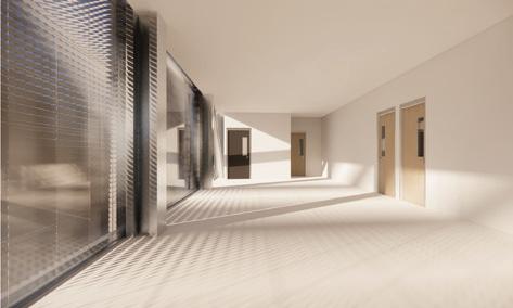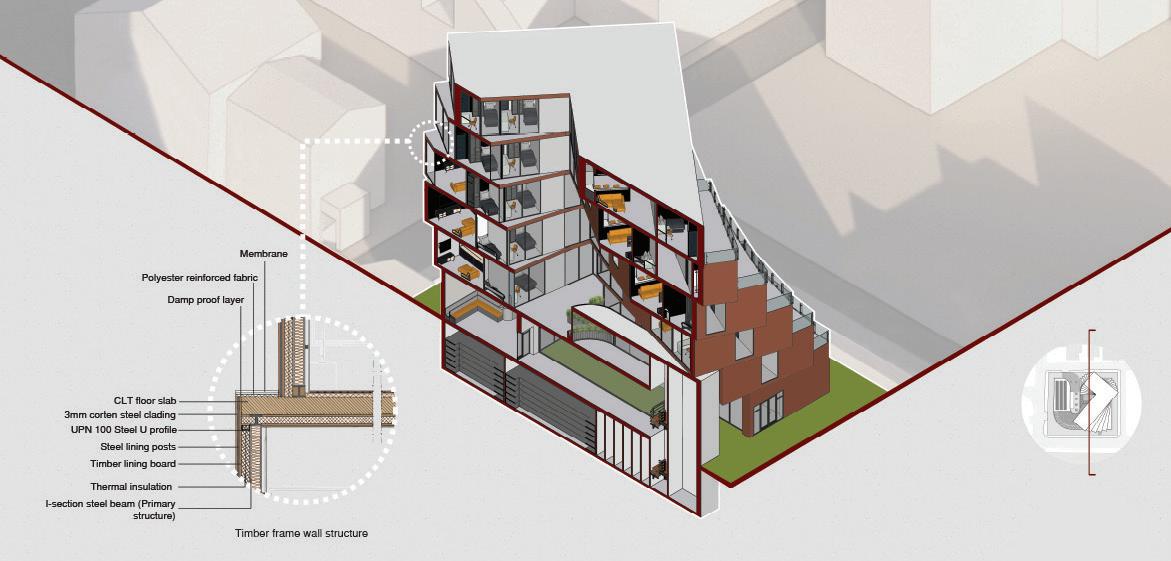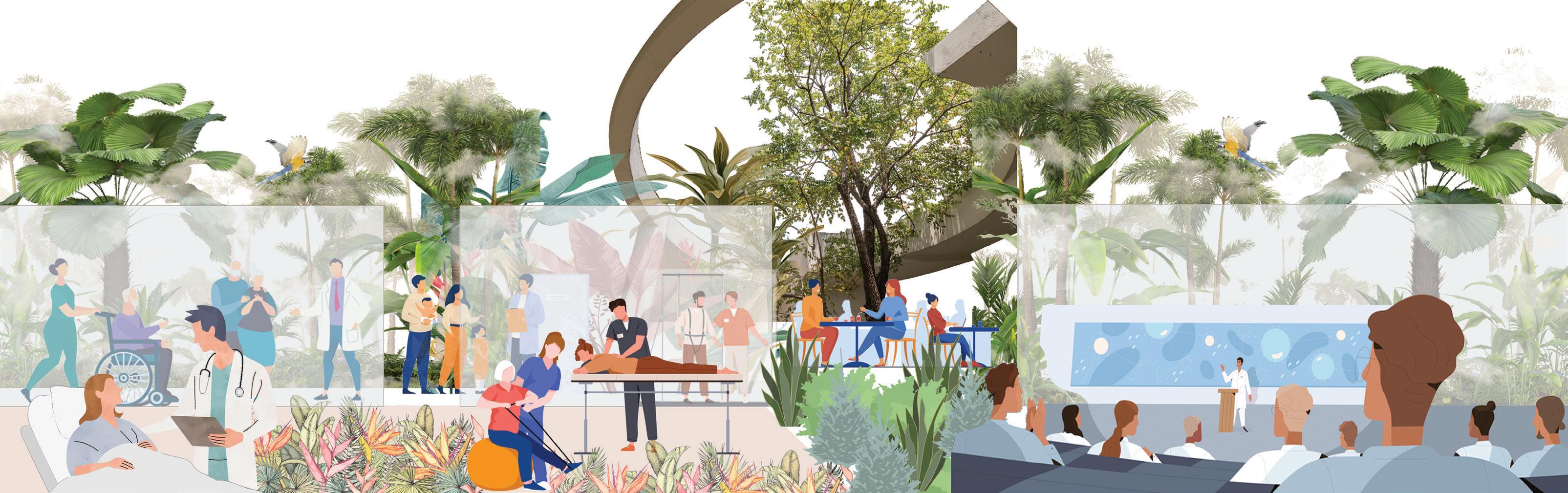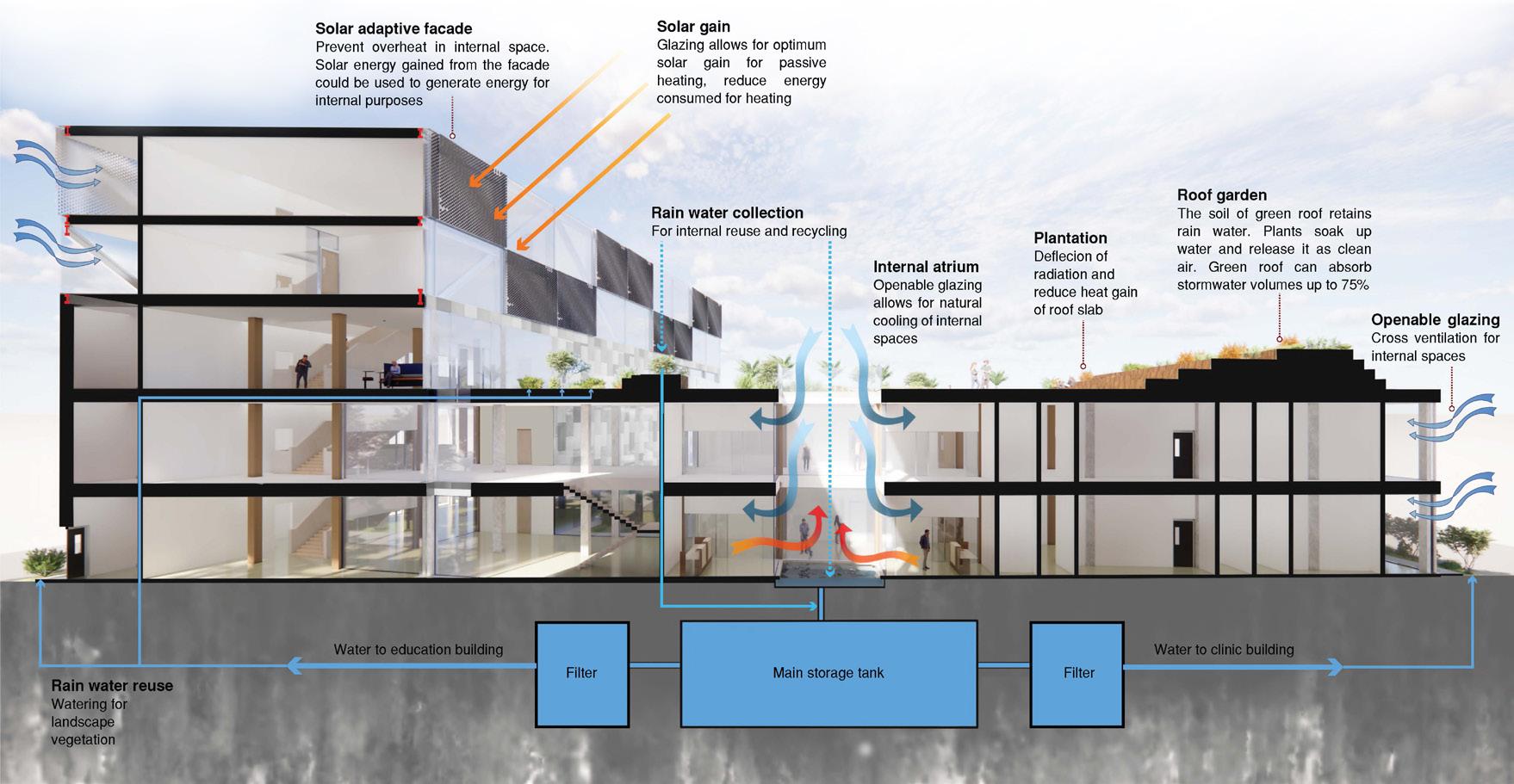 Located in Hulme - Manchester, the brief asks for additional facility of the Health and Education Department of the Manchester Metropolitan University (MMU). The program also seeks to maximise green spaces on-site through the South yard and the roof garden. The roof landscape plays a vital role in delivering the atelier's current theme of "Emergent Biophilic Design", which emphasises the connection between users and the natural elements. The green spaces of the scheme are the connectors that bring the users together, and bringing the project closer to the public in a wider context.