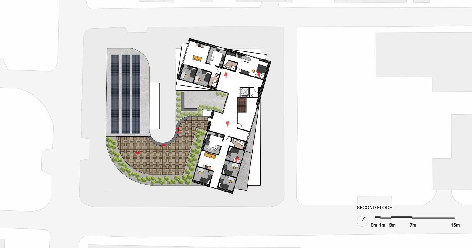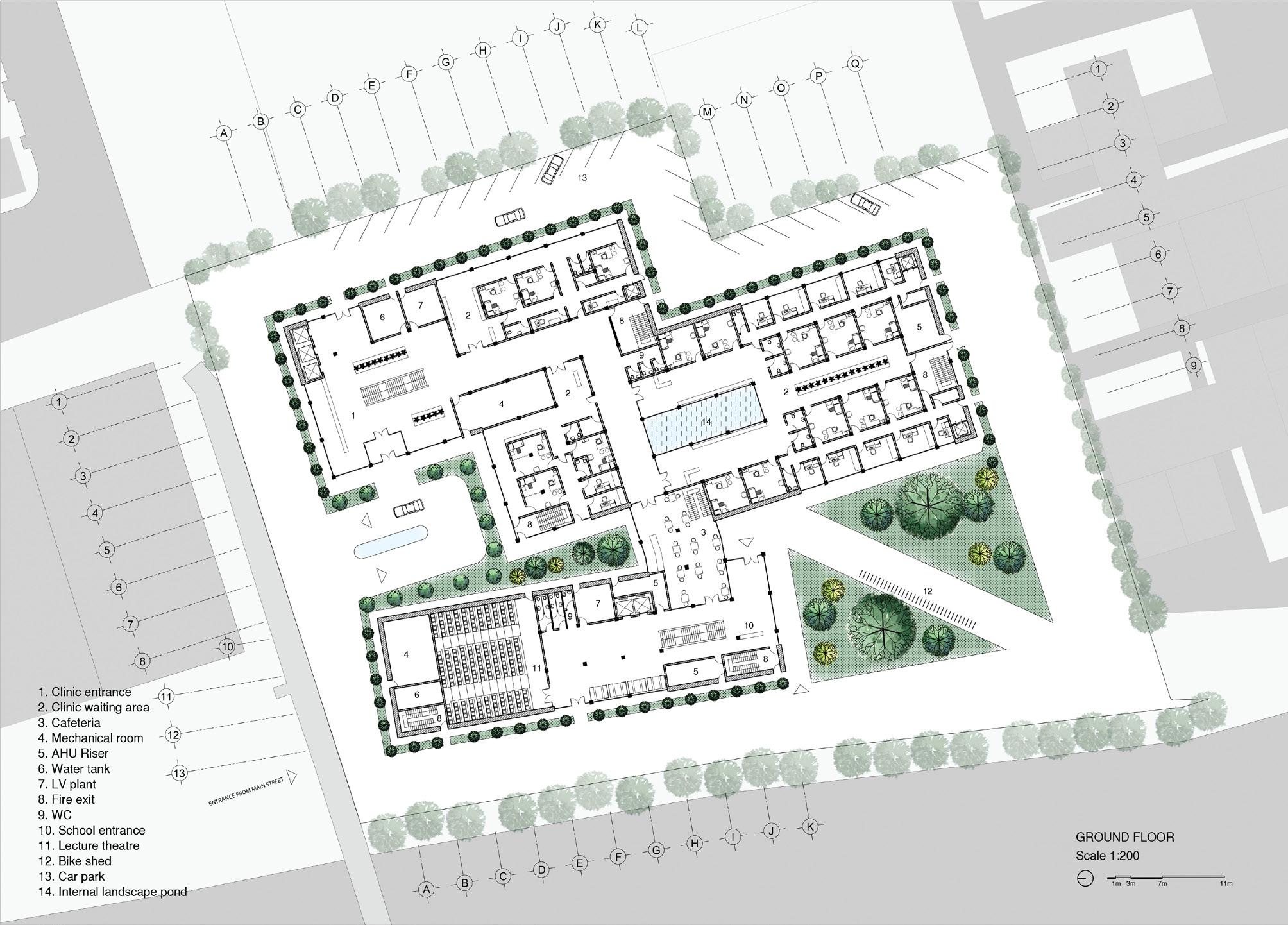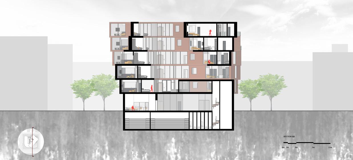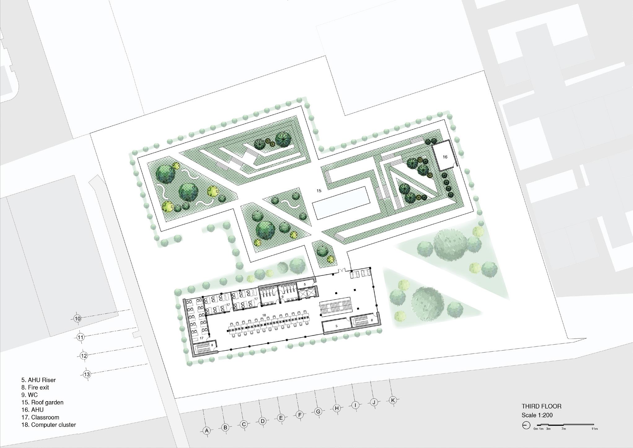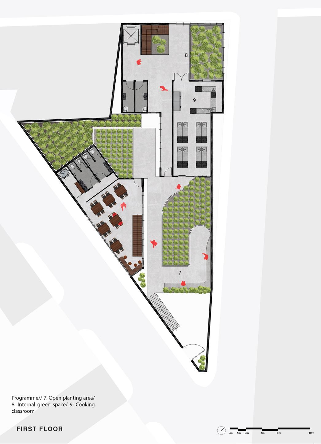 The concept was to make greenery the main concept, putting it forward as the recognition point of the project. The acute corners of the traingular site was efficiently utilised as additional courtyard, bringing more green space to the scheme, and nourished the neighbourhood with these natural elements. The building acts as a cooking school and a place for planting education and fresh vegetables market. Plants were grown on-site and served as ingredients for the cooking classes and the small canteen of the school. Green spaces maximise the connection between human and nature within the programme, attracting the neighbourhood through an accessible route for the public.