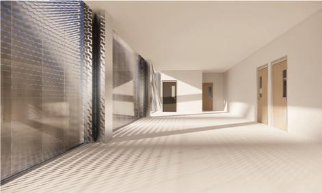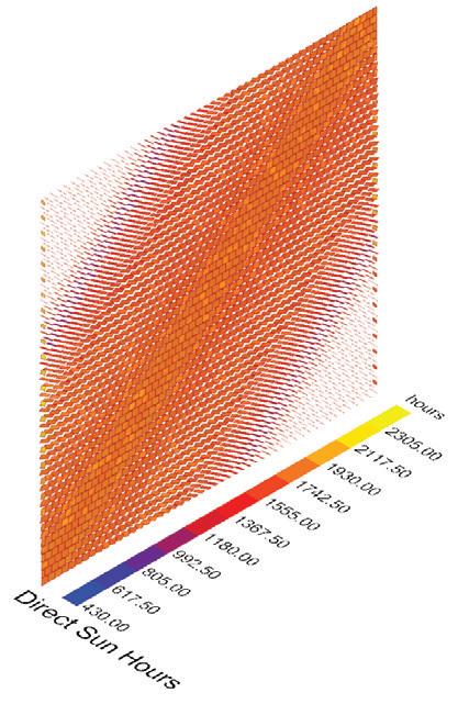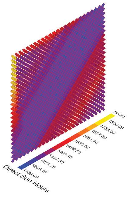 diamond panels Average sun hour: 2100 hours Average sun hour: 1250 hours Average sun hour: 1750 hours Average sun hour: 1020 hours Average sun hour: 1790 hours Average sun hour: 1100 hours Average sun hour: 1800 hours Average sun hour: 990 hours Diamond panels give good interior shading with decent level of opening in the facade for natural light to come in so the interior space can benefit from natural lighting, create visual comfort. The facade gives view to the exterior, but not as much as the triangular panel facade. Quad panels give good shading but at the same time block quite a lot amount of natural light, making the transition between non-shaded and shaded area sudden. The facade does not allow much view to the exterior, and the interior space does not benefit much from natural lighting. Square panels give good shading but at the same time block quite a lot amount of natural light, making the transition between non-shaded and shaded area sudden. The facade does not allow much view to the exterior, and the interior space does not benefit much from natural lighting. Triangular panels give good interior shading yet allow most view to the exterior. Openings in the facade are adequate for natural light to come in, create visual comfort for the interior. Daylight can reach to the entire width of the corridor so the space can still benefit from natural lighting. Triangular panels iteration gives the least sun hour in winter means most sunlight can reach the interior, efficient for passive heating and daylighting Most hour of sunlight obtained means most solar energy could be generated, and most efficient in preventing the interior space from being overheated when using the diamond shape panels