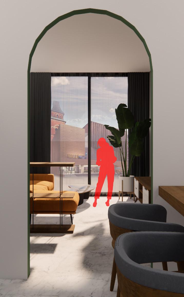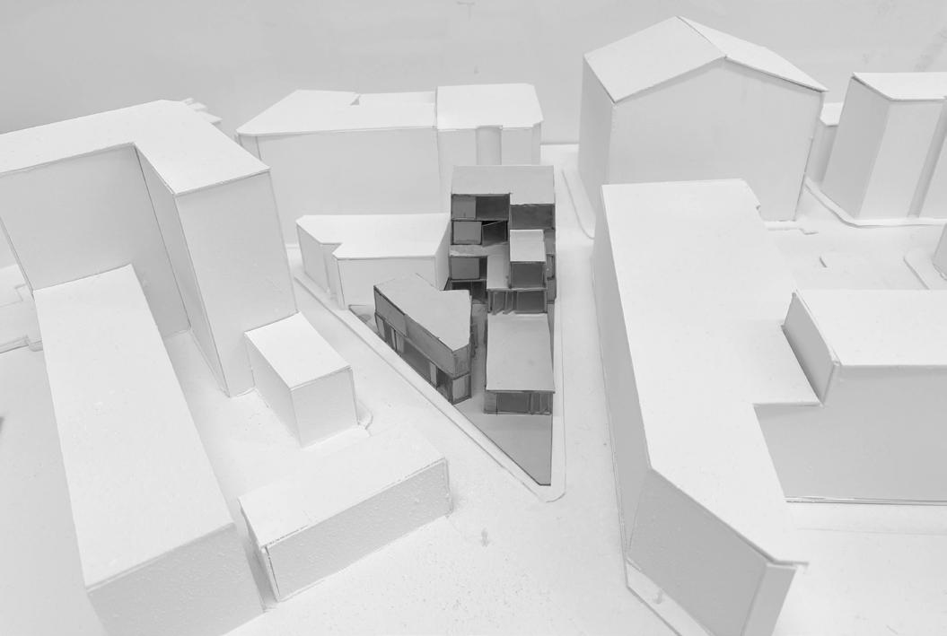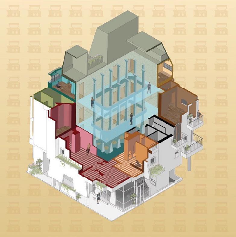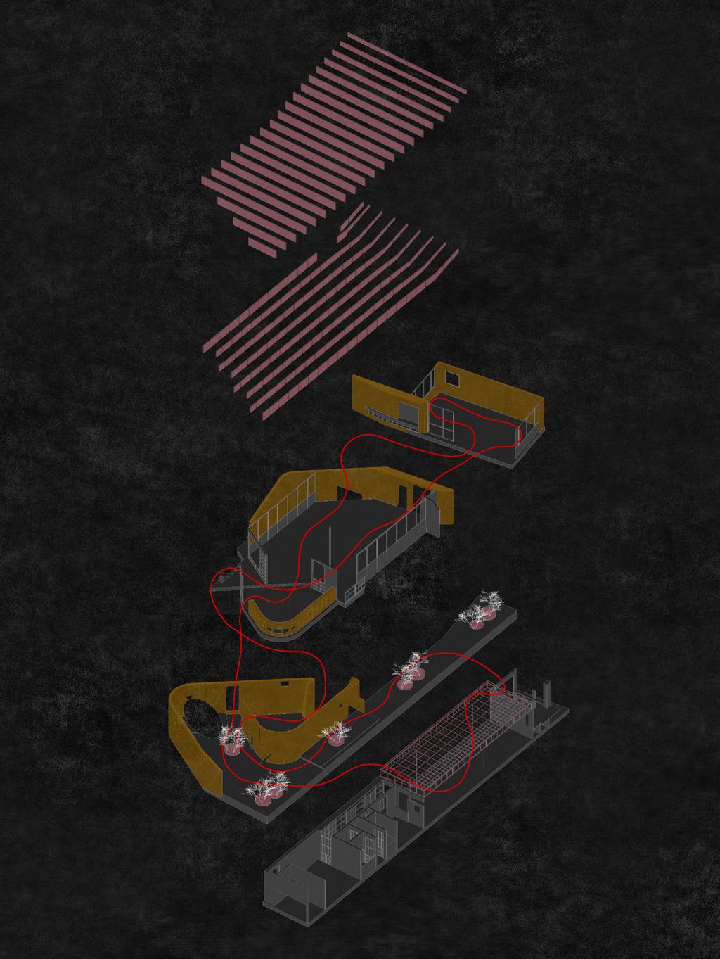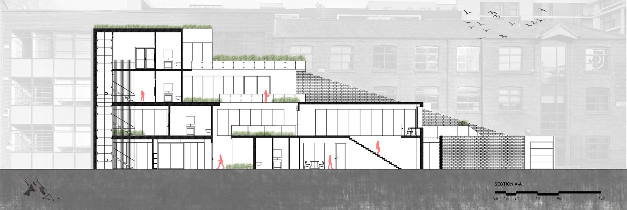 Ancoats - Manchester has a rich industrial history, now becomes a friendly neighbourhood with a mix of residential and business areas. Responding to the brief asking for a communal living space for a group of artists, the scheme proposed an apartment building dedicate for sculptors. The concept was to turn the building into an attraction spot - a twisting form that could be seen from almost any directions. Greenery was chosen to be one of the main design driver that acts as both the attracting element, bringing people to the site, and as a connecting element of the three main programmes: residence, public and performaning space.