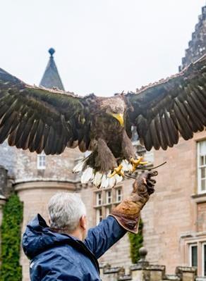 The Glenapp Eagle Fishing experience can only be described as unique. This once-in-a-life time experience is not available anywhere else in the world. To start this amazing day, you will get acquainted with the Eagle, and fly a few other raptors from the Castle grounds before heading to Girvan where you will embark the Glenapp Castle Boat and enjoyed a spirited ride along the rugged Ayrshire coast before anchoring below the cliffs at Culzean Castle. You will be joined by our expert Falconers and ‘Ripley’, the famous African Sea Eagle, and will experience an epic demonstration of an eagles power and agility as she flies between the shoreline and the vessel, taking food rewards from the water directly beside the Boat. Whether you simply watch in awe, or take photographs and videos for your personal ‘insta’ moments, the memory of this experience will last forever and the spectacle will never again be so close to you.