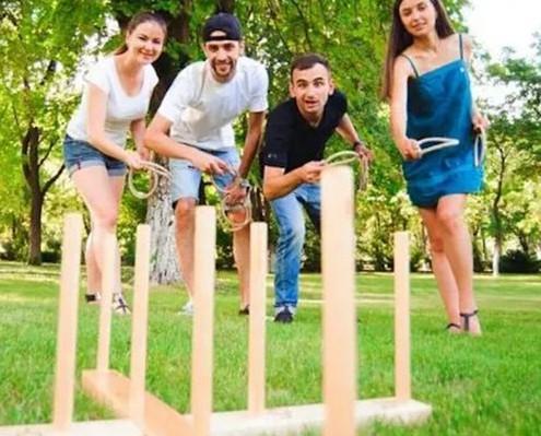 The traditional game of Quoits has a long and venerable history dating back to ancient Greece. This ancient game is easy to play, in basic terms rope hoops are thrown at the wooden pins to accumulate points, the player with the most points wins!! This can be played by adults and children. Think tactically and try to outsmart your opponent!