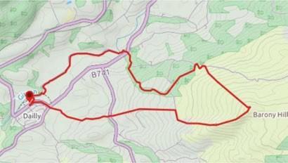 Route description: Stage 1: A ‘Dailly Trails’ board in the village square offers a large scale map of the route out of the village; follow the B741 east as it passes the church and curves right to reach a crossroad. Cross when safe and head up the surfaced minor road as indicated by the metal oak leaf path marker. This metal post will quickly become familiar as the walk progresses, representing the Colliers’ Oak where local mine owners used to meet with the Laird of Dalquharran. Continue up the road, gradually gaining height.
