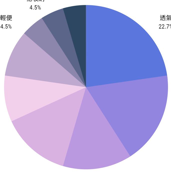 其他附加功能 4.5% 易收納 4.5% 輕便 4.5% 良好的包覆性 9.1% 減少對肌膚的摩擦 9.1% 減壓 13.6% 使用便利性 13.6% 舒適度 18.2% 透氣 22.7%