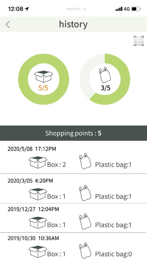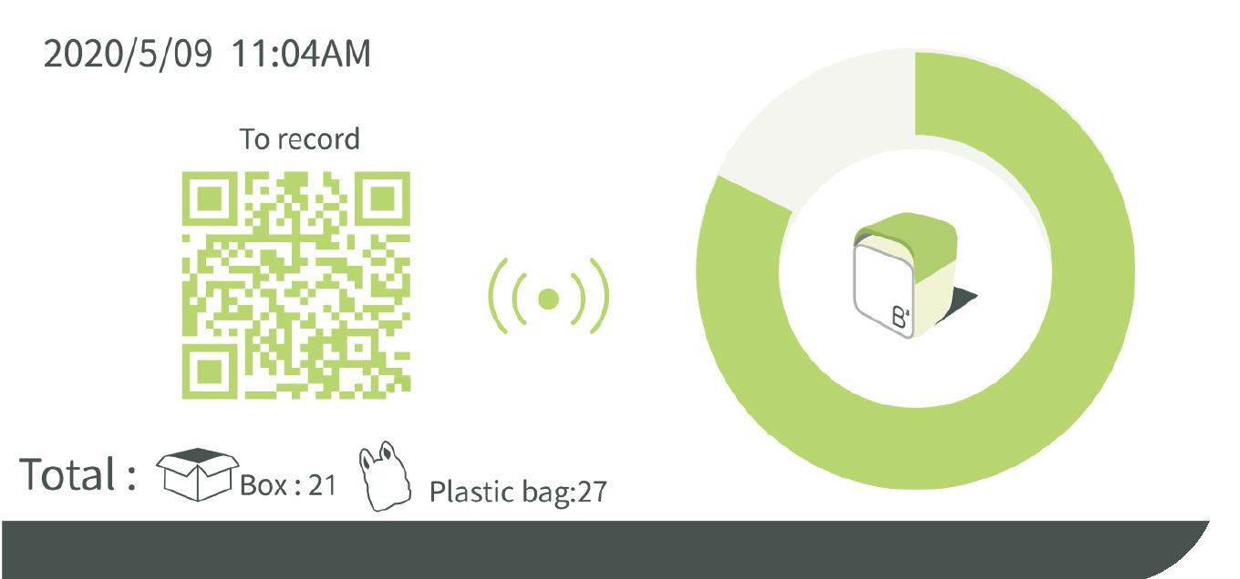 紙箱/包裝袋 投入回收站 裝置自動 計算數量 產生QR cord 手機APP 掃描並記錄數量 達標後獲取 消費折抵