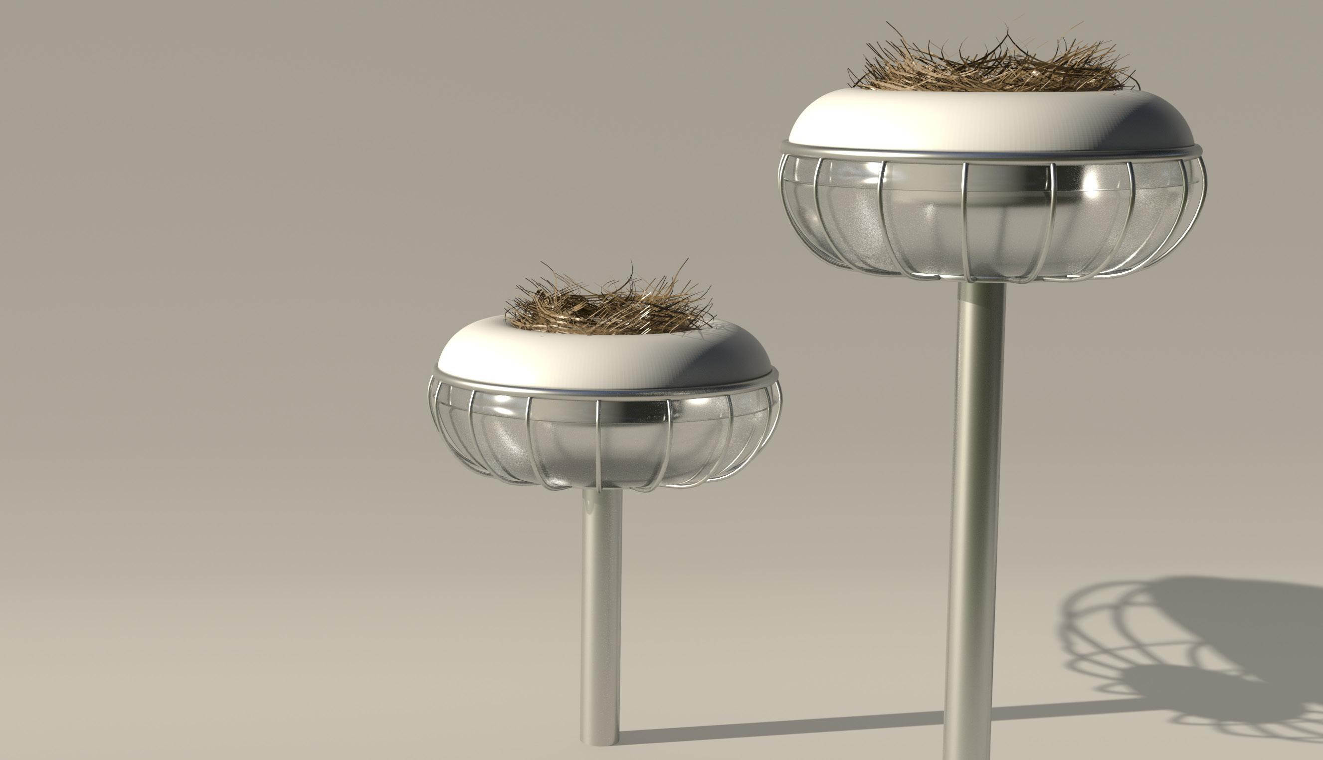 設立於草叢中(離地約40-60公分),金屬管插入地面固 定 ,承托上方鳥巢本體 , PVC塑膠布內盛裝中藥 液體,經自然溫度蒸發並由雛鳥吸收,達到提升免疫力的 效果。 設立於較水平的樹枝上(約150公分),使用螺絲或外接 金屬片鎖於樹上 , 中間盛裝中藥液體,透過蜂巢狀網 格 經由自然溫度蒸發至上層 ,由雛鳥吸收後有效提高 免疫力。