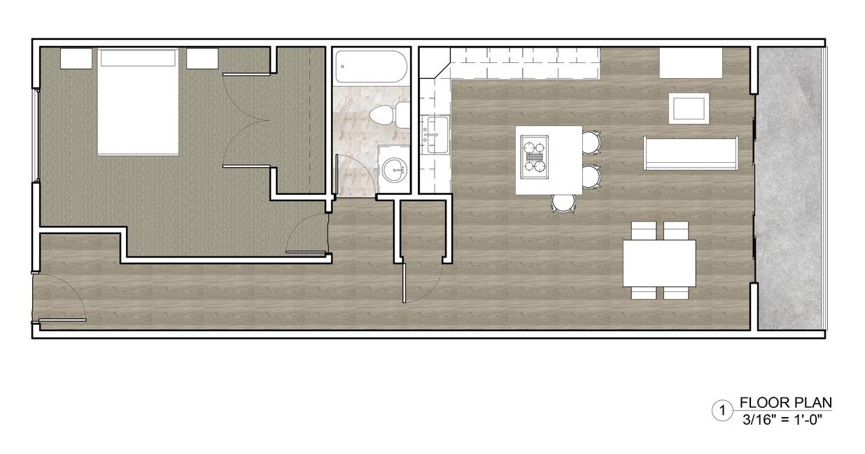 Single unit apartment in a larger building The unit was to be a one bedroom, one bathroom design with a full kitchen and living space as well as in unit laundry and mechanical room