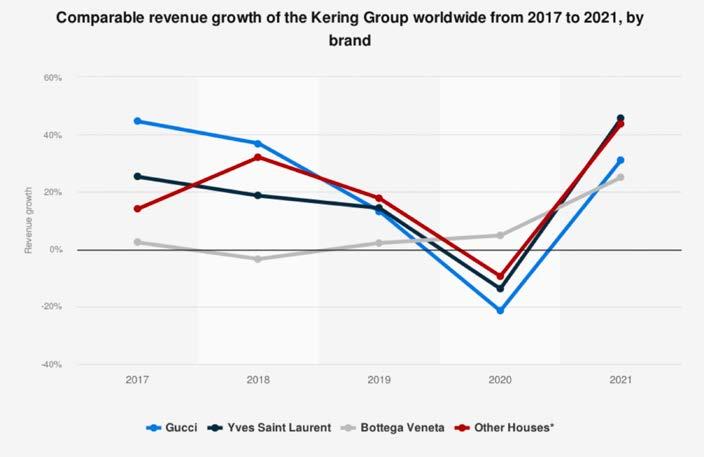 Kering. (February 17, 2022). Comparable revenue growth of the Kering Group worldwide from 2017 to 2021, by brand [Graph]. In Statista. Retrieved April 14, 2022, from https://0-www-statista-com.library.scad.edu/ statistics/1097132/global-revenue-growth-of-the-kering-group-by-brand/