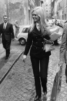 Get Brigette Bardot's look in the double-breasted Balmain blazer. The gold buttons add a touch of glamour and can give an indication of how to style the blazer. Pair with a matching wide leg black trouser for a monochrome look and accessorize with gold hardware pieces / gold jewellery or watch.
