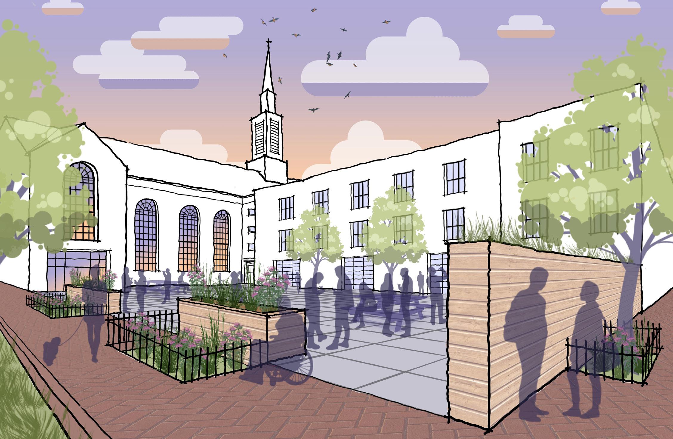 Below: program diagram for adaptive reuse of church building into a community center, library, and beer garden.