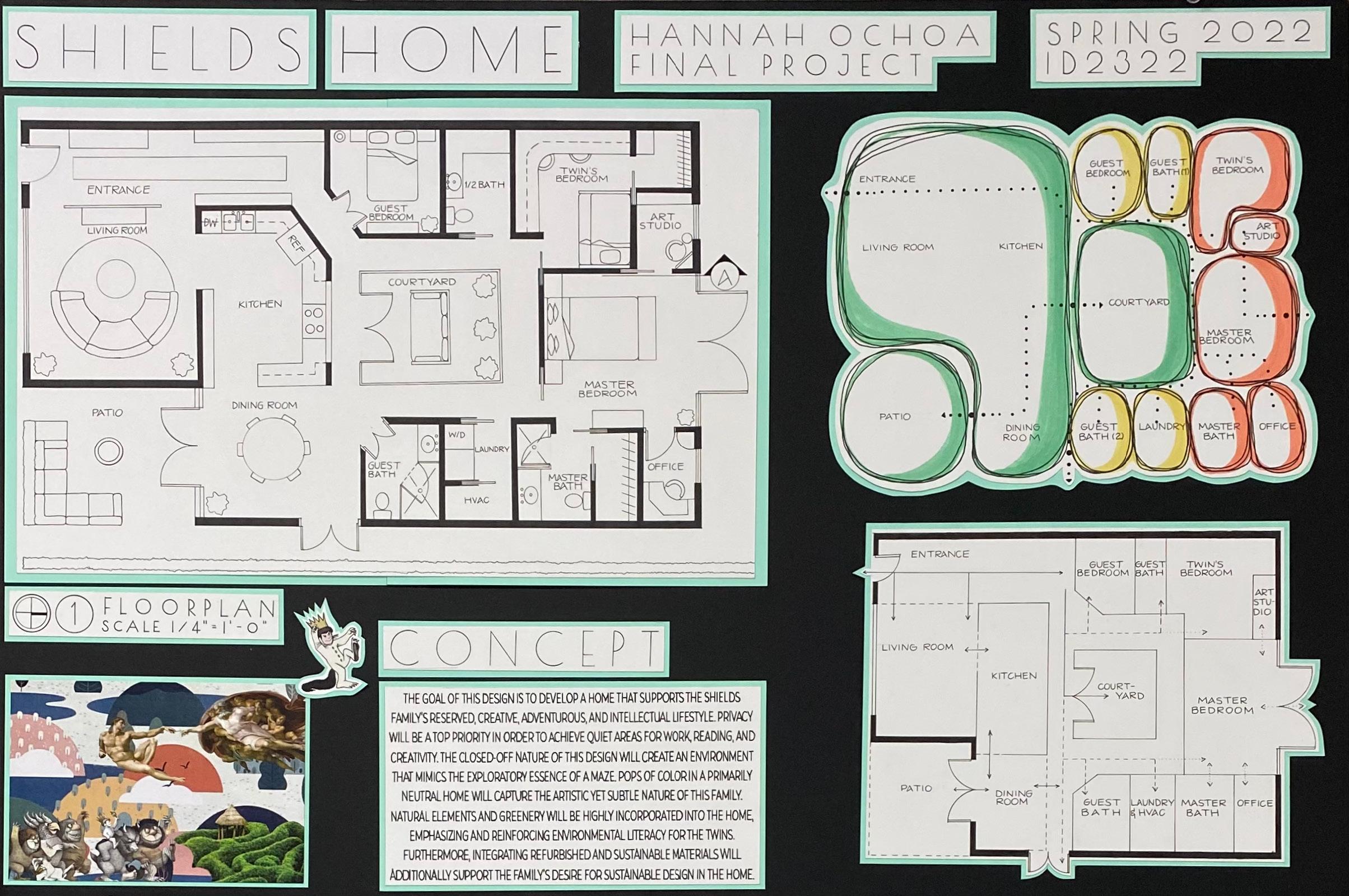 I have organized my portfolio aiming to showcase the evolution and advancement of my skills such as space planning, research, rendering, concept development, model making, and proficiency in design software. This portfolio covers work from Design Graphics I, Basic Interior Design, Visualization and Presentation Techniques, Design Development, Studio I Residential, as well as Studio II Commercial Design from my last six semesters at Texas State University (Fall 2021-Spring 2024). I hope this collection of work provides a clear and enjoyable sense of my passion, abilities, and design approach. hannahochoabusiness@gmail.com