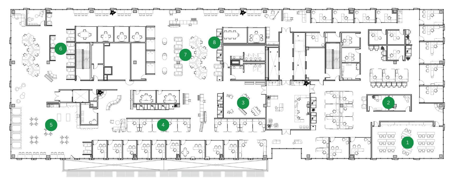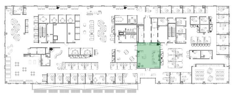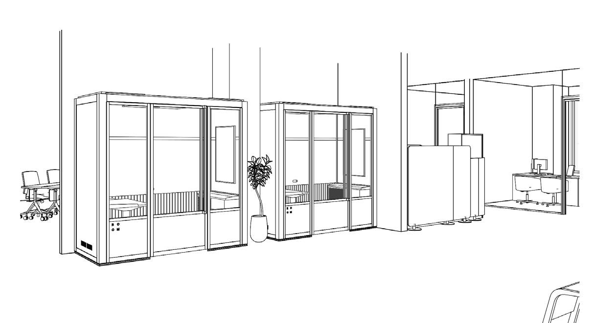 Adjacent to employee desks are focus pods and call booths that give employees easy access to a private and quiet space. These allow employees that do not have private offices to discuss confidential information without being heard or causing disruptions for others.