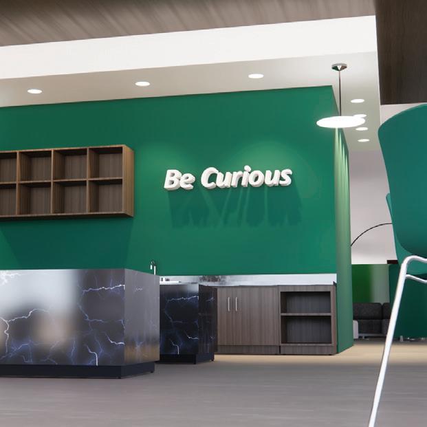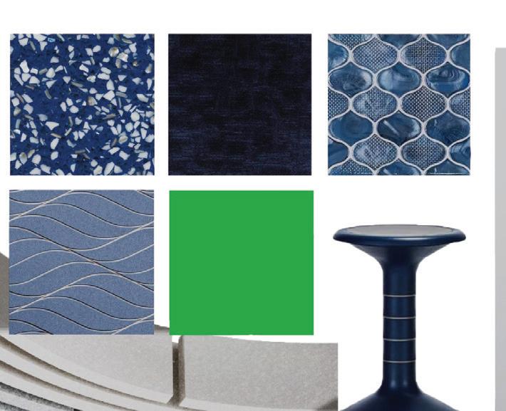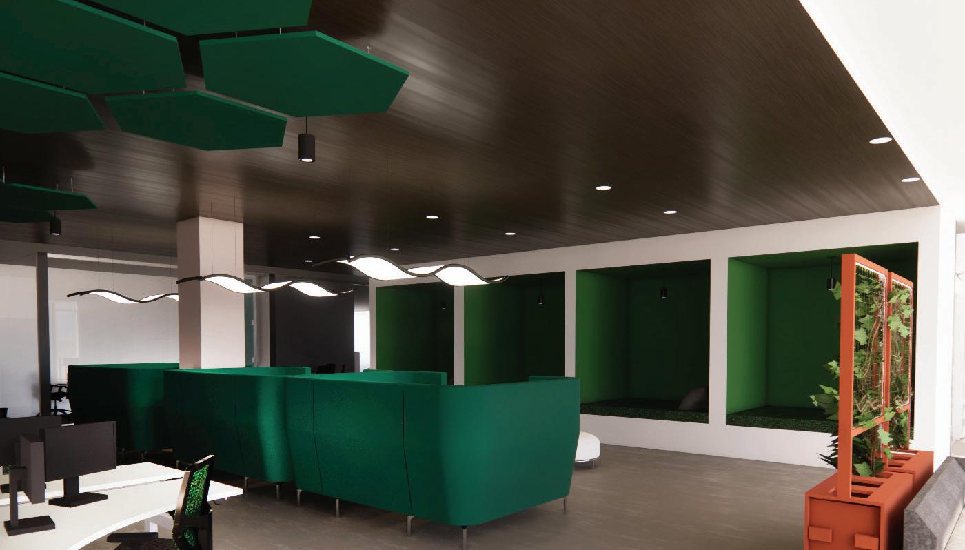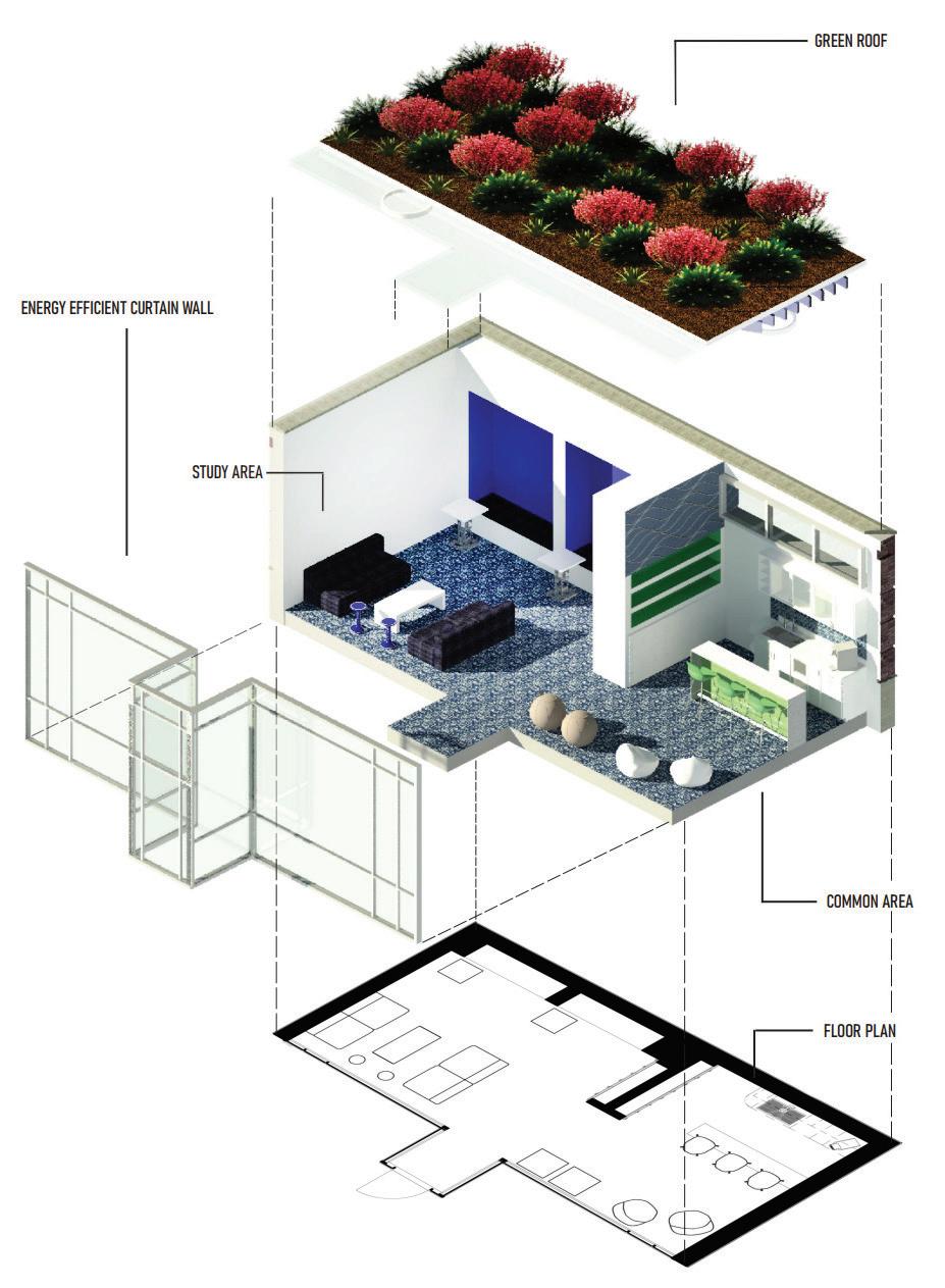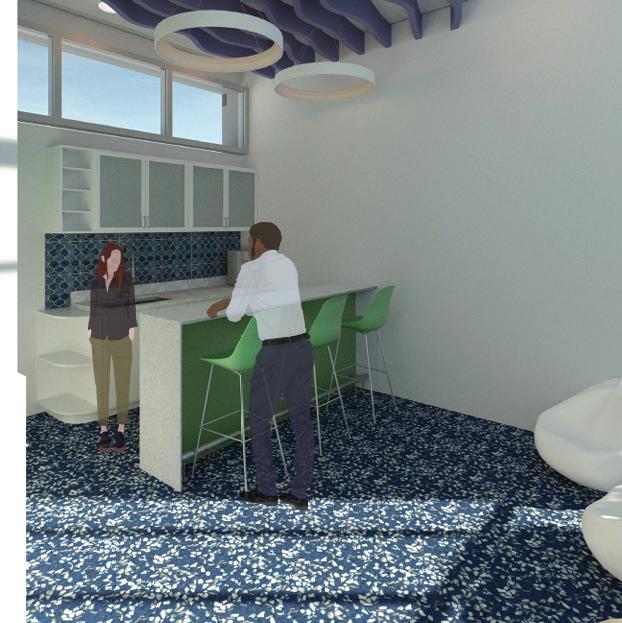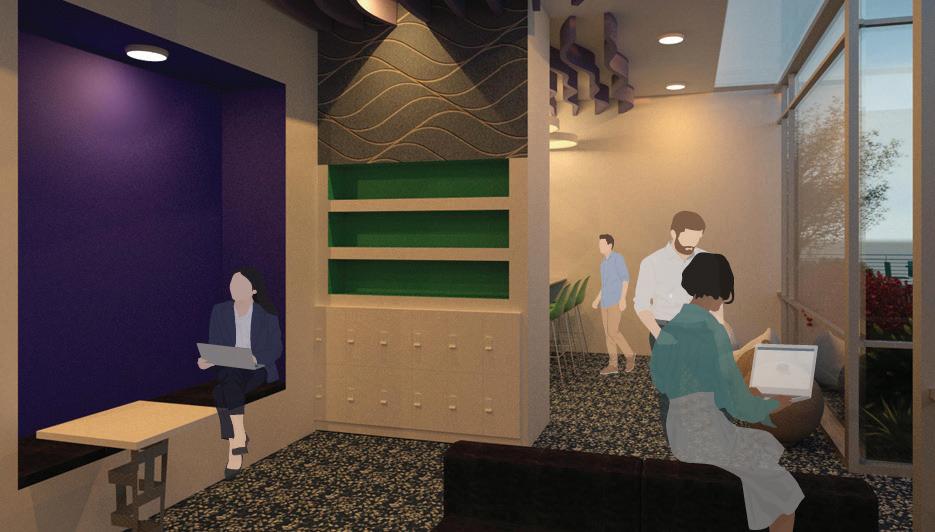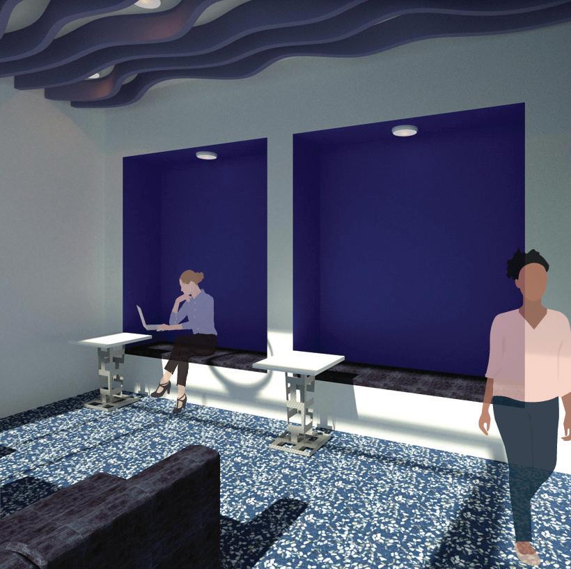 Biophilic studies reveal that natural light can reduce stress and improve mood, and natural elements like plants have enhanced mental and emotional wellbeing. Incorporating strategic acoustic design elements within the space, such as sound-absorbing materials, not only cultivates a serene atmosphere but elevates the experience by introducing organic acoustic suspended ceilings that artfully mimic water ripples, seamlessly integrating with the biophilic ambiance. A versatile seating area designed to cater to diverse preferences features wobble chairs, beanbags, and exercise balls, creating a dynamic atmosphere that encourages relaxation, creativity, and interaction. Long-distance commuters need an oasis, a sanctuary away from the chaos of their journeys and a busy campus, a place where they can pause, recharge, and find solace.