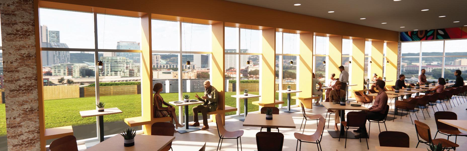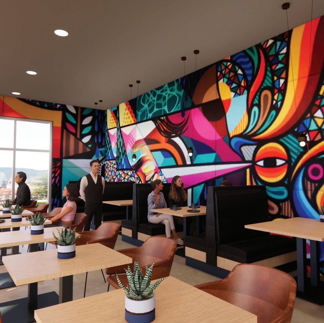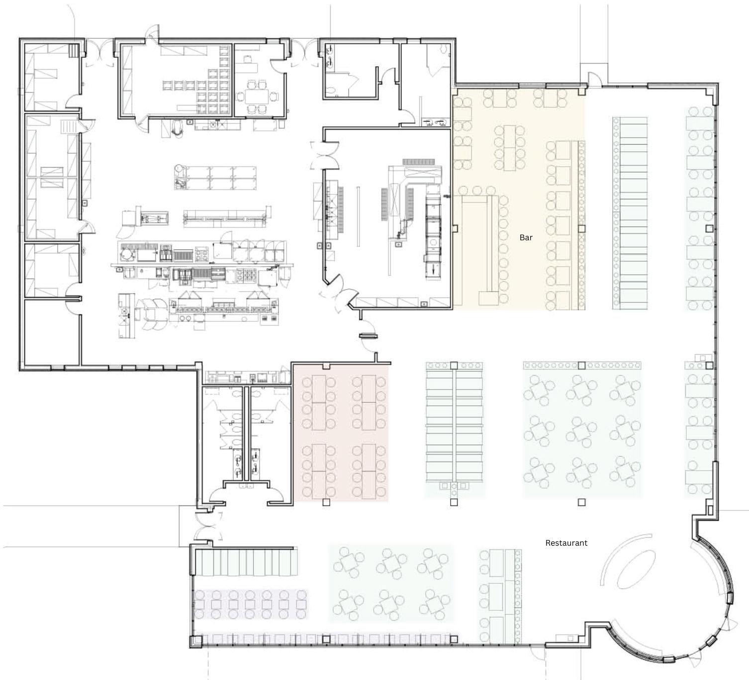 To create an eclectic, casual dining experience through the use of varied lighting and seating elements, creating various opportunities for differing comfort levels. Vivid colors also create an energetic environment that is conducive to a lively atmosphere to cater to the upbeat culture of the neighborhood and surrounding businesses. Accents of reclaimed wood and plant life cater to the casual atmosphere, keeping a grounded environment.