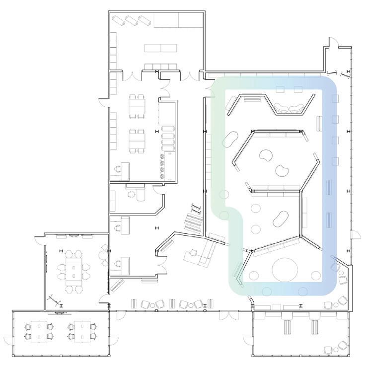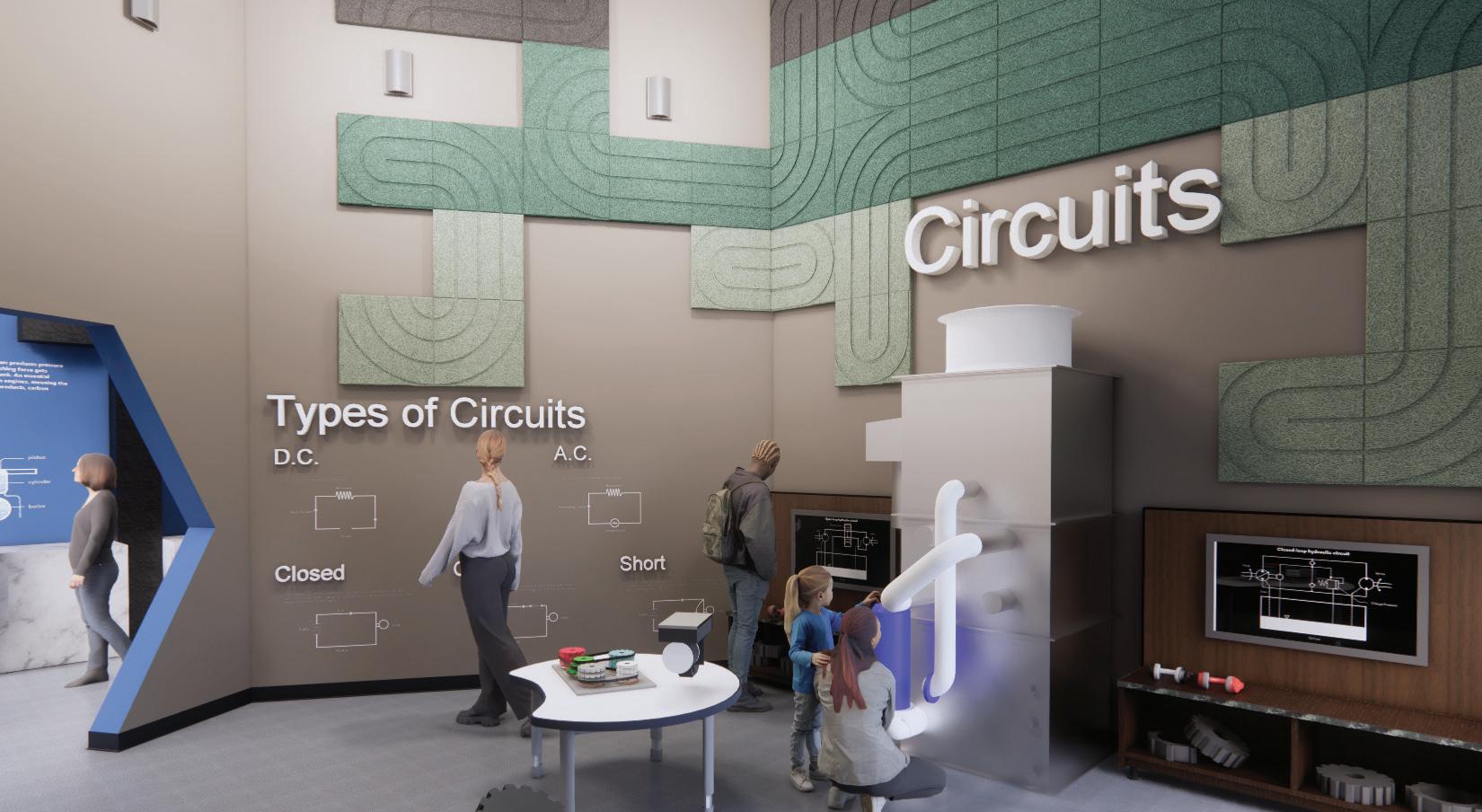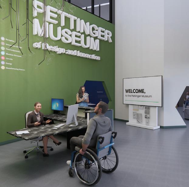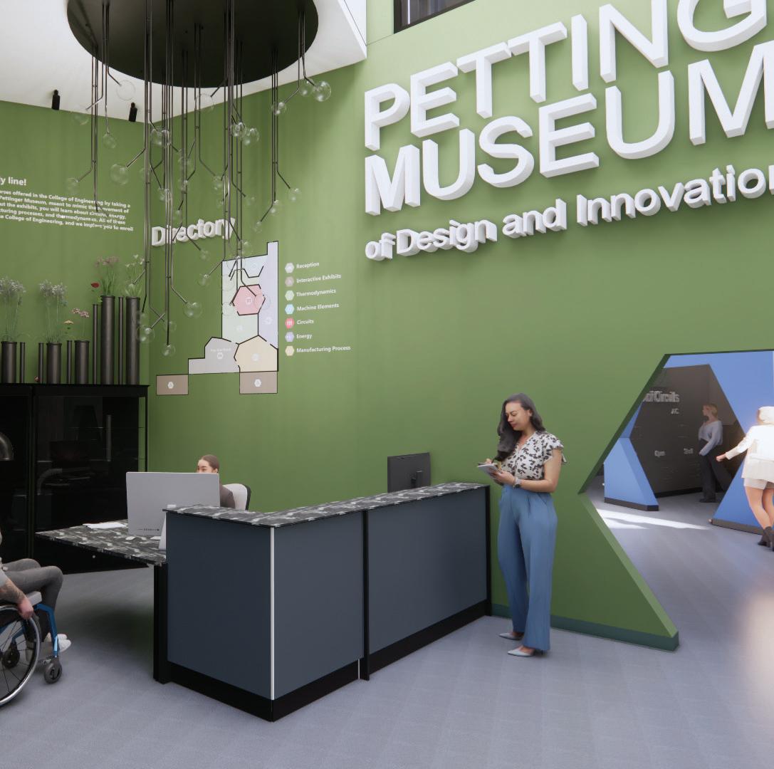 The Pettinger Museum facilitates the spread of knowledge about mechanical and energy engineering to the students of UNT to foster community between Discovery Park and the main Denton campus. The museum provides adjustable elements, such as flexible and ergonomic office furniture, for its staff to ensure their satisfaction and well-being. The layout considers the pathways staff take to offer an efficient environment when it comes to the setup and maintenance of the gallery and its content. Through implementation of wayfinding techniques, interactive design, and prospect and refuge theory, the museum hosts an engaging, educational, and accommodating space that provides its users with a sense of comfort while visiting. Multiple resting spots are available throughout the museum for those who cannot stand or walk for prolonged periods of time, and these spots are pulled away from the main gallery to give these users privacy.