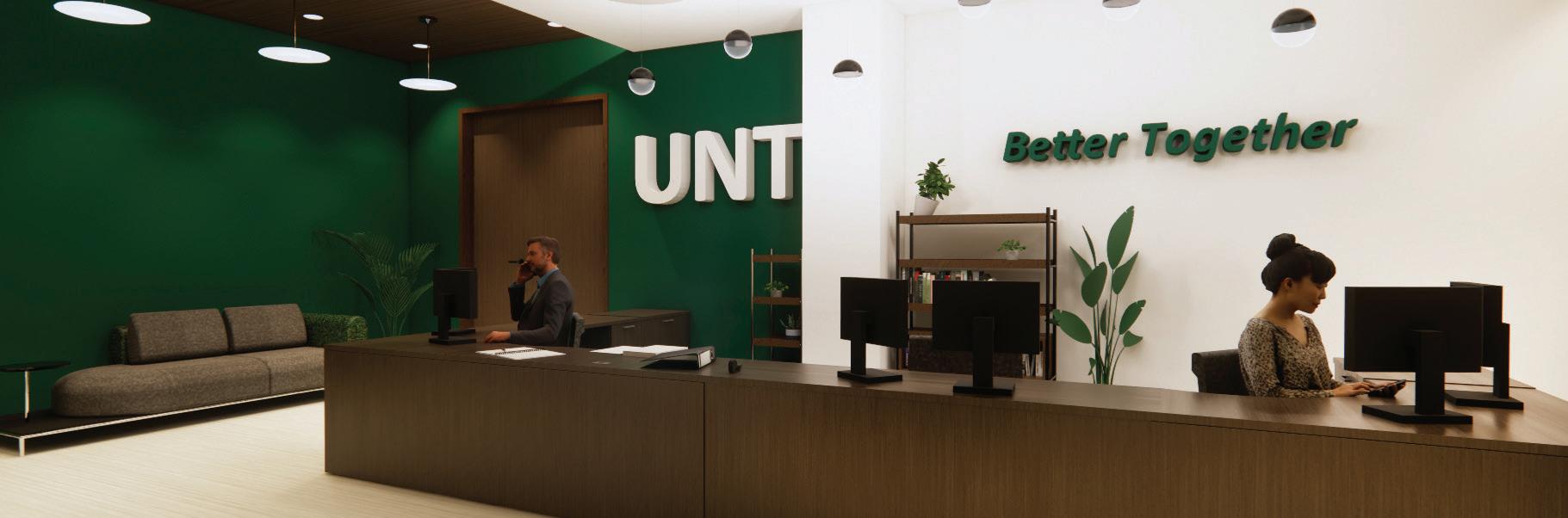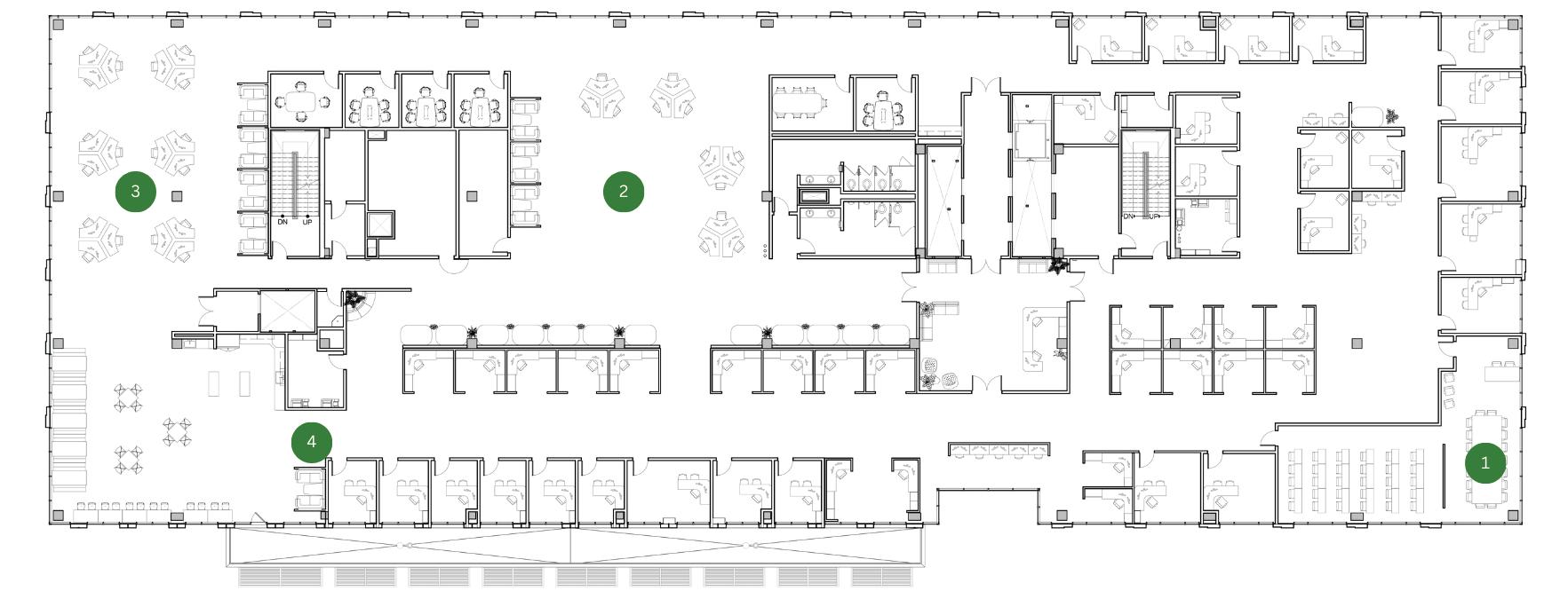 The new University of North Texas Facilities office fosters an efficient and productive environment. Employees are equipped with semi-private or private workspaces to limit outside distractions and increase focus. Likewise, dedicated focus pods and call booths are located beside employee cubicles, allow employees easy access to more private spaces. These spaces provide acoustical privacy for both the user and other employees working nearby. Further, this office houses multiple touchdown spaces for employees to utilize and collaborate, increasing team communication and overlap. There are multiple small conference rooms located throughout the floor, each equipped with large mounted screens to aid in the sharing of information. The training area/large conference room and large display space beside the entrance both feature rearrangeable tables to be utilized depending on the size of the group using the space.