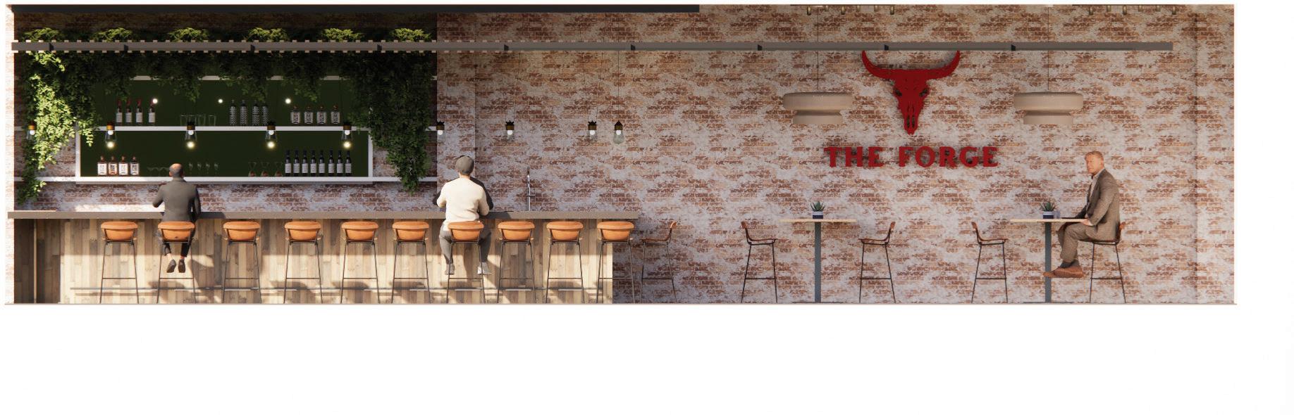 The Forge strives to promote customer engagement by creating an experience for its customers, done so through the deliberate staging of experiences throughout the design through the use of eclectic art, lighting, and finishes. The use of decorative elements enhances the dining experience, and the restaurant becomes not just a place to purchase food, but a total social experience. Creating a casual environment is central to the theme of The Forge. The use of nonuniform lighting is appropriate for relaxed and casual behavior, while partially illuminated spaces also create greater visual interest. Incorporating prospect and refuge theory into the layout is necessary for providing optimum customer comfort levels by creating opportunities to “see without being seen”. Less densely crowded seating areas are perceived more positively, especially by women, thus using a variety of seating options and separating areas with partitions and plants helps increase the desired level of perceived privacy.