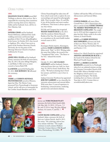 2000 Jeremy and TORI INGRAM PLATT announce the birth of their fourth child, Lily Mae, July 13, 2012, 1:25 p.m., 7.3 lbs. and 19 3/4 in. long. She joins siblings Zachary, 10, Lauren, 9, and Eli, 7. 2002 CATHY BLOSE COPELAND and her husband, Adam, announce the birth of their son, Latham Patrick, April 8, 2012. She writes, “He is thriving, and we love every minute with him.” The couple continues to teach at James Madison University. Contact them at 1966 Russell Drive, Harrisonburg, VA 22801. 42 | THE HANOVERIAN • WINTER 2013 | www.hanover.edu