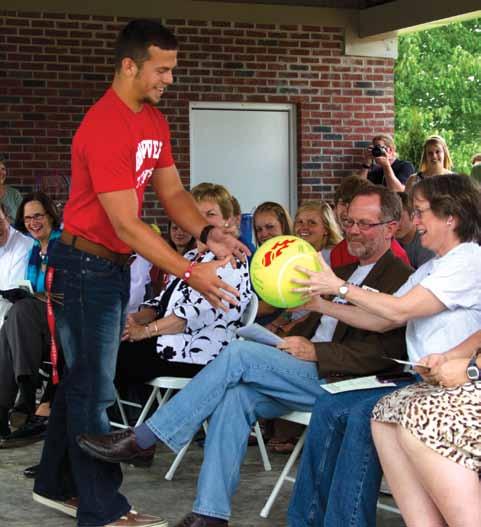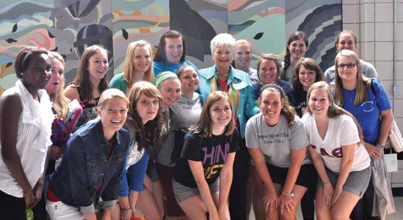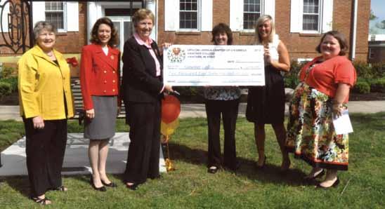 House director Sue Fairchild, a 50-year member, received the first Dianna Risk Service award for her contributions to the chapter. Presenting a check for $2,500 to Hanover president Sue DeWine were Melanie Shain, Chi Omega Foundation treasurer, Letitia Fulkerson, national Chi Omega president, Erin Houchen Whicker ’98, chapter house corporation president, Abby Chambers ’14 and Heather McDonald ’96, chapter advisor.