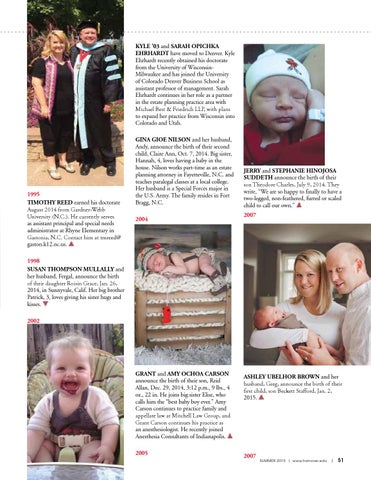 GRANT and AMY OCHOA CARSON announce the birth of their son, Reid Allan, Dec. 29, 2014, 3:12 p.m., 9 lbs., 4 oz., 22 in. He joins big sister Elise, who calls him the “best baby boy ever.” Amy Carson continues to practice family and appellate law at Mitchell Law Group, and Grant Carson continues his practice as an anesthesiologist. He recently joined Anesthesia Consultants of Indianapolis. 2005