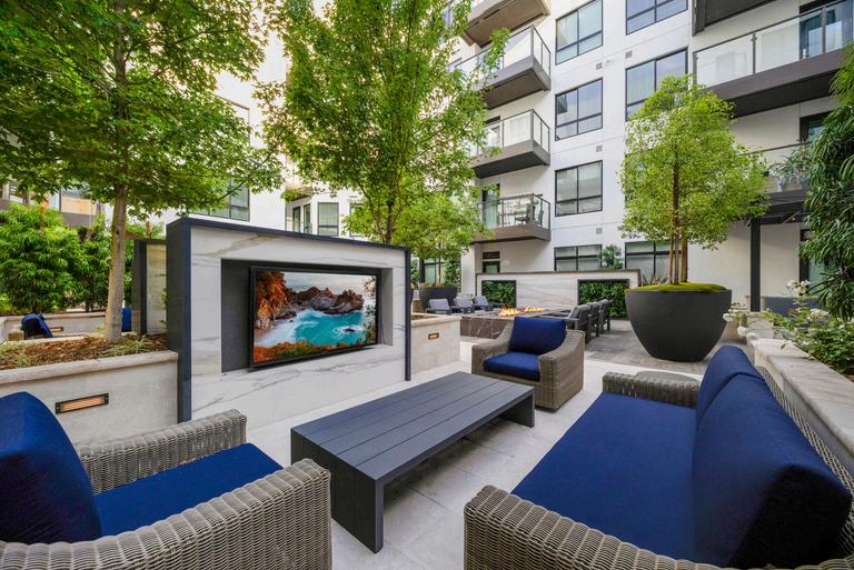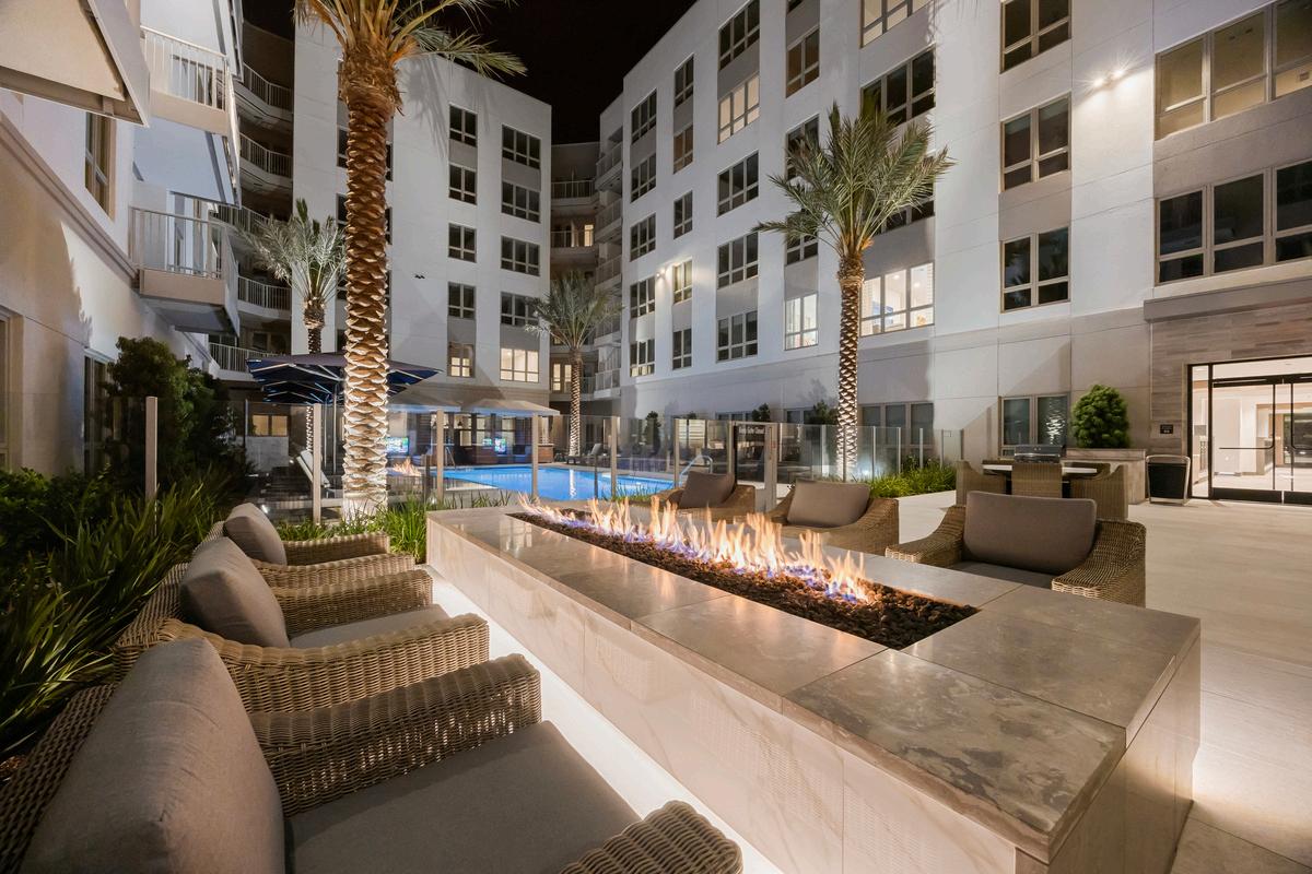 Expansive courtyards with lush landscaping, coworking tables, lawn games, fireside lounges, and chef-quality grills with open-air dining