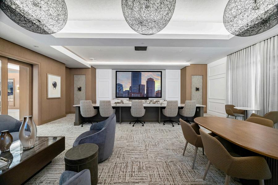 Media lounge with theater-style seating and spaces for both work and relaxation