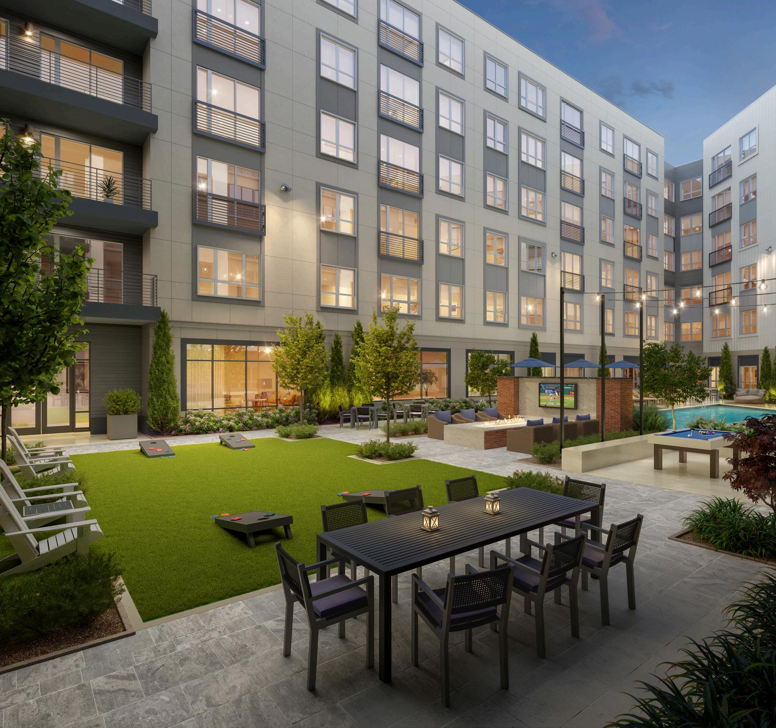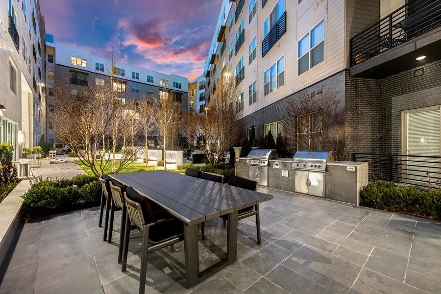 Social courtyard featuring lush landscaping, outdoor games, cozy fireplaces and chef-quality grills with open-air dining areas