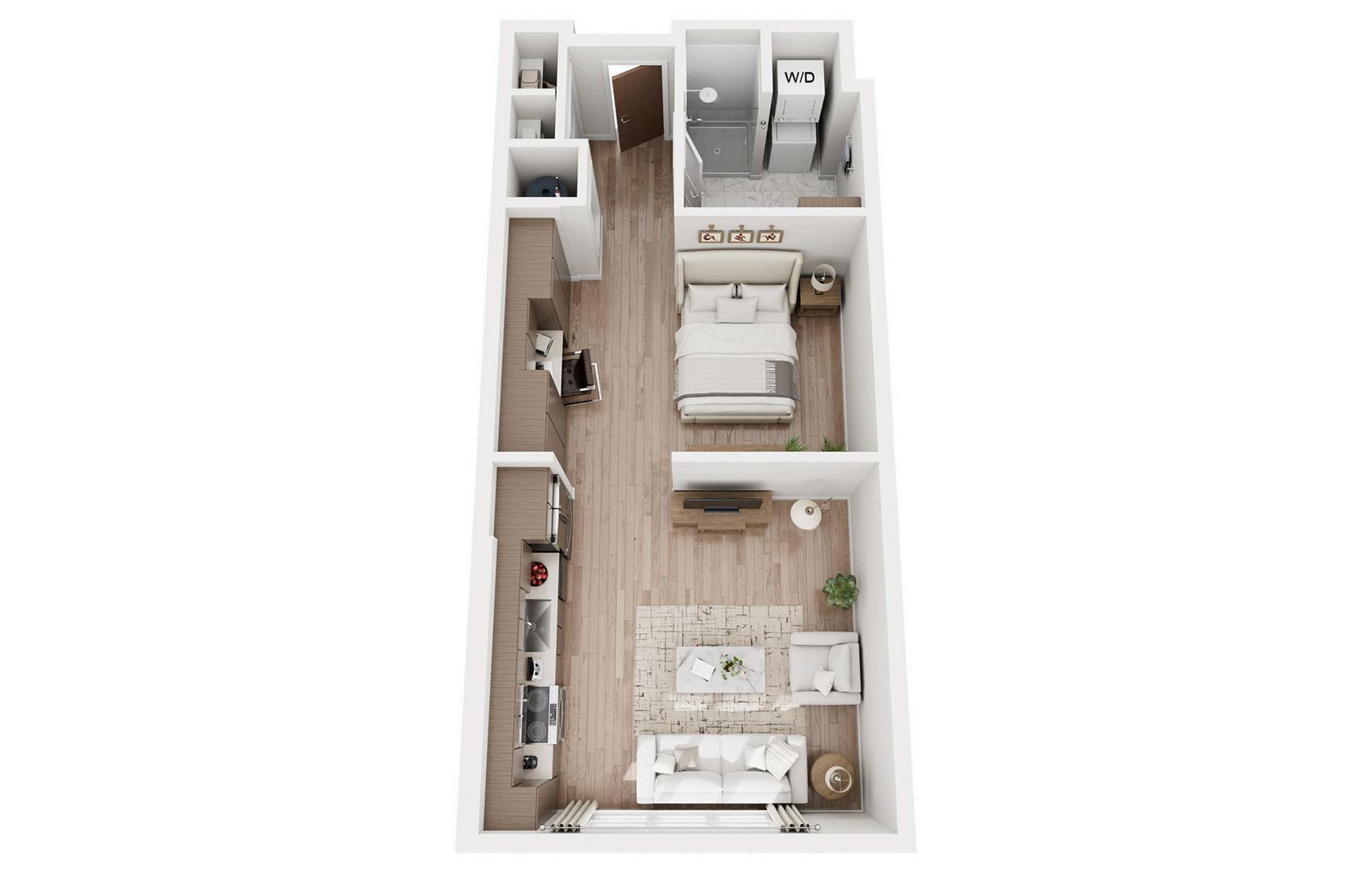 Generous ceiling heights and modern wood-style flooring in elegant neutral tones