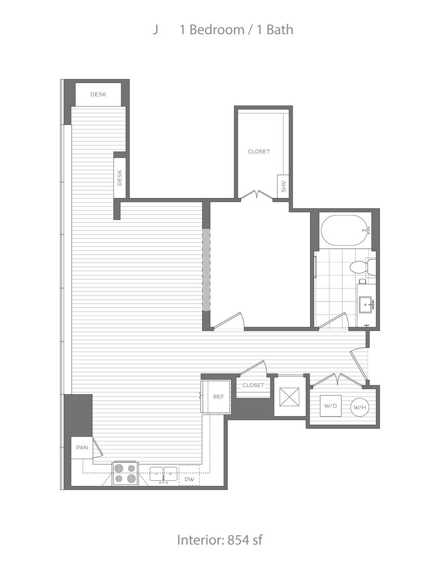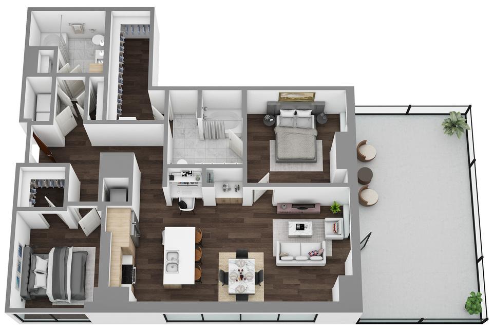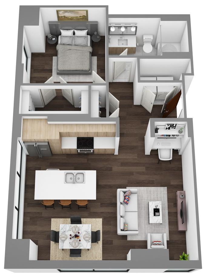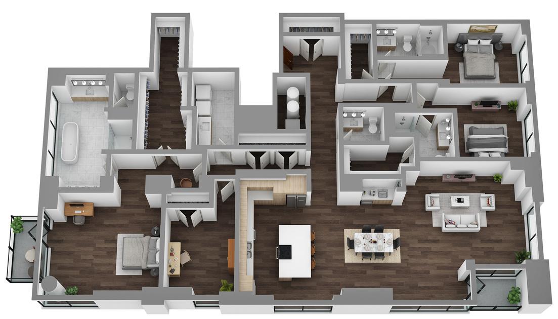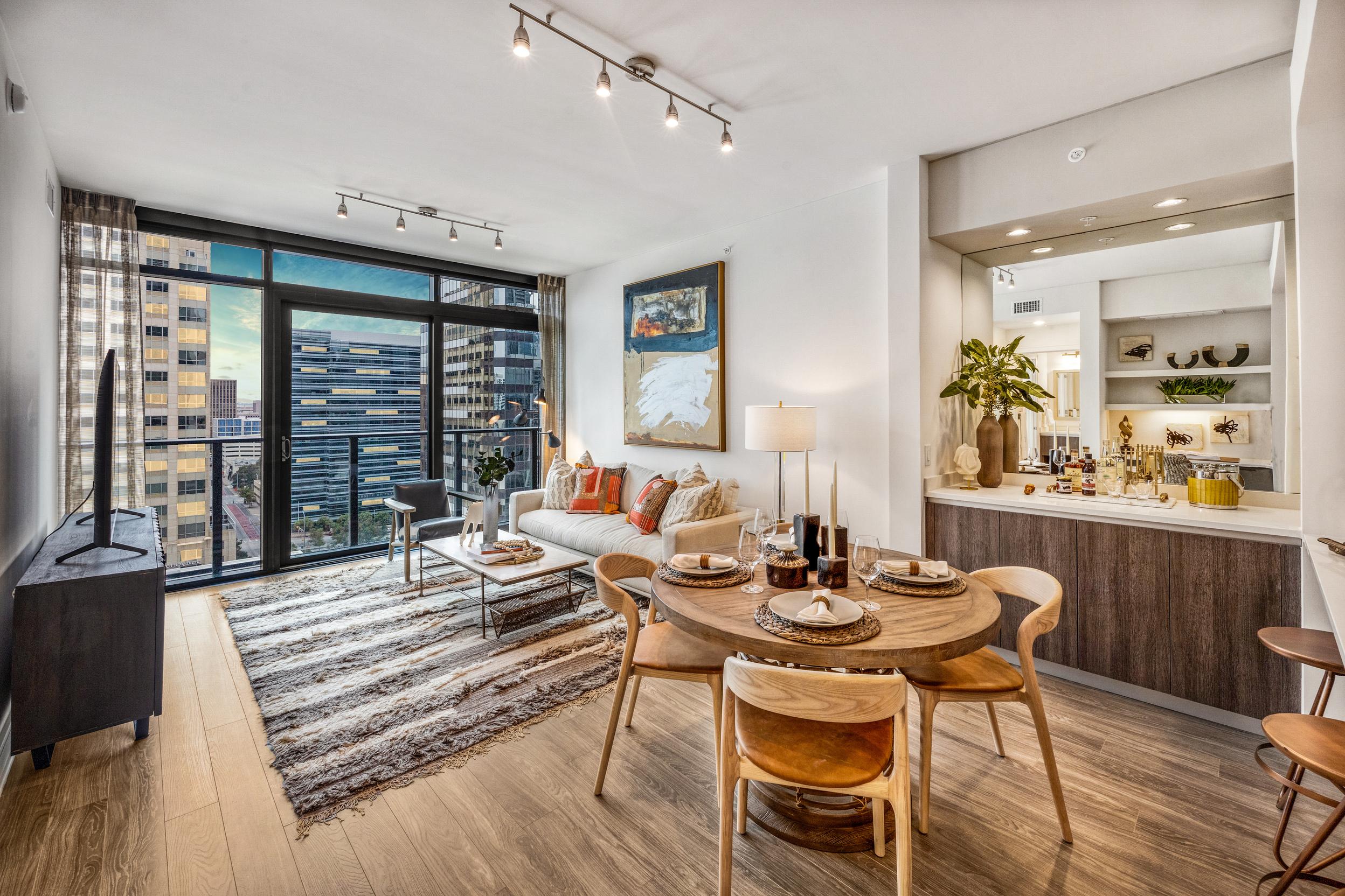 Generous ceiling heights ranging from 9.5’ to 12’, and modern wide-plank wood-style flooring in elegant neutral tone finishes