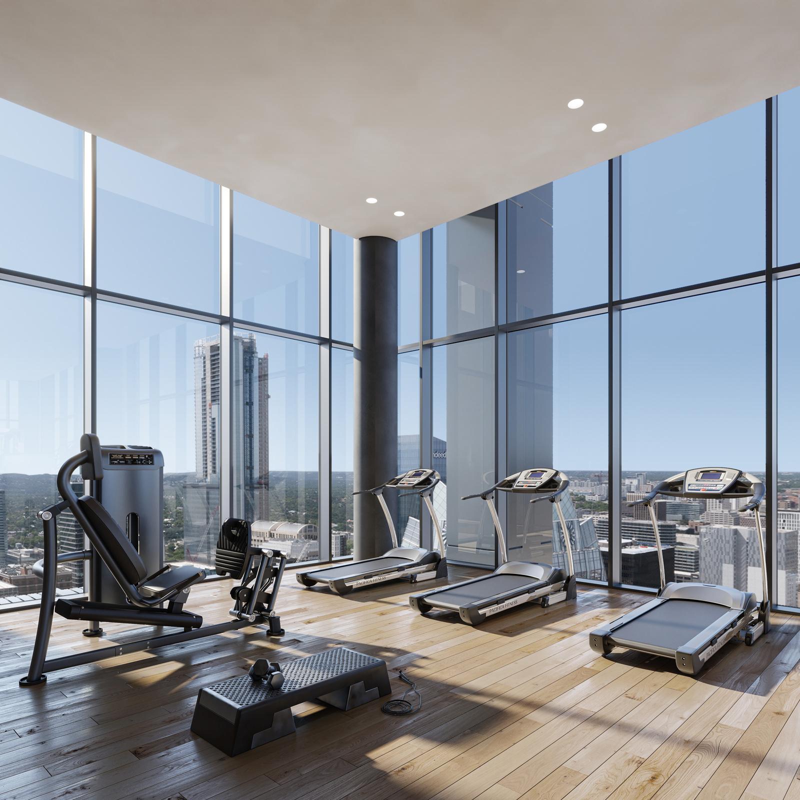 Top-floor innovative fitness center equipped with everything you need to break a sweat while taking in sweeping views of the Austin skyline