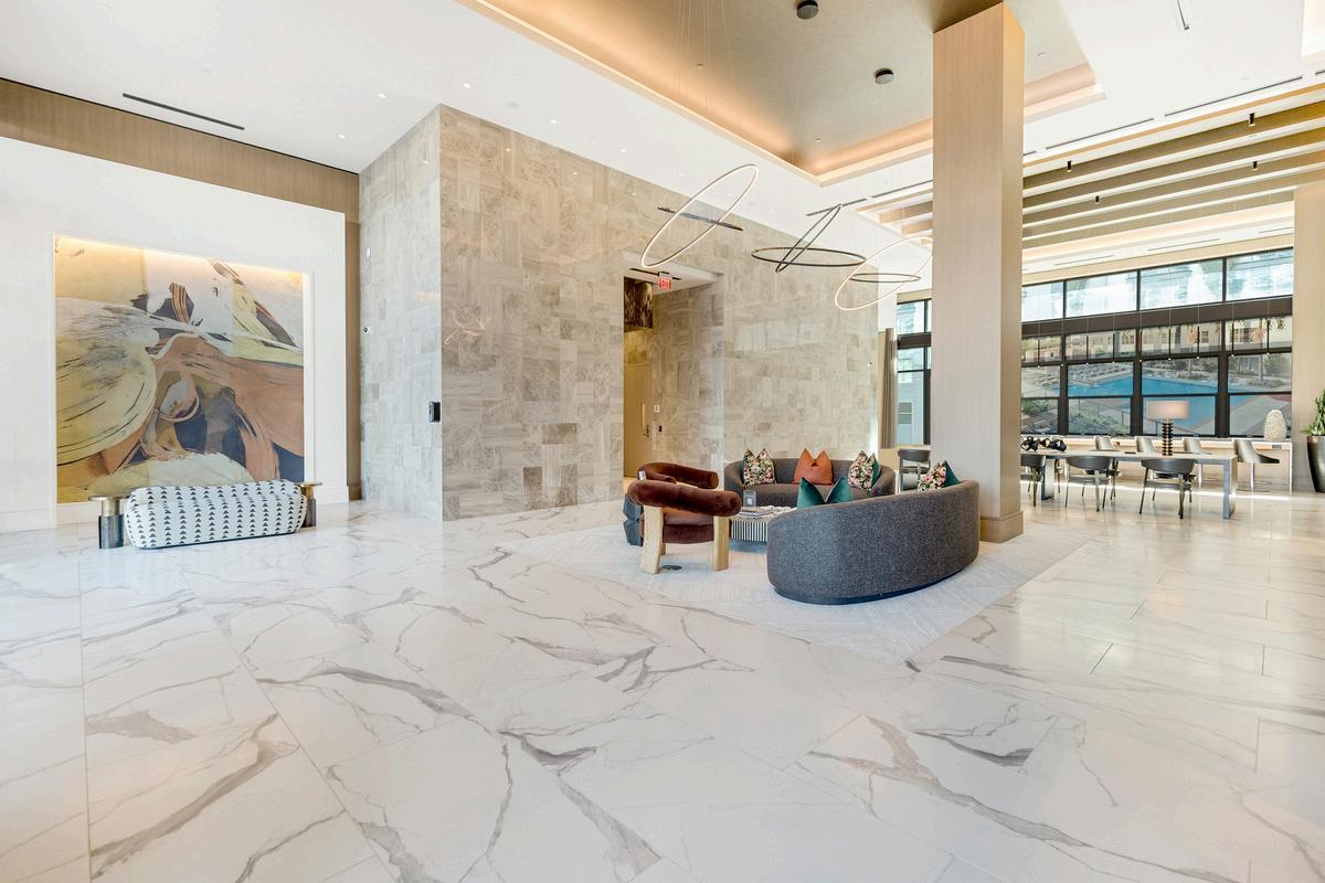 Resident lounge and entertaining kitchen offering indoor-outdoor flow and a variety of spaces to gather