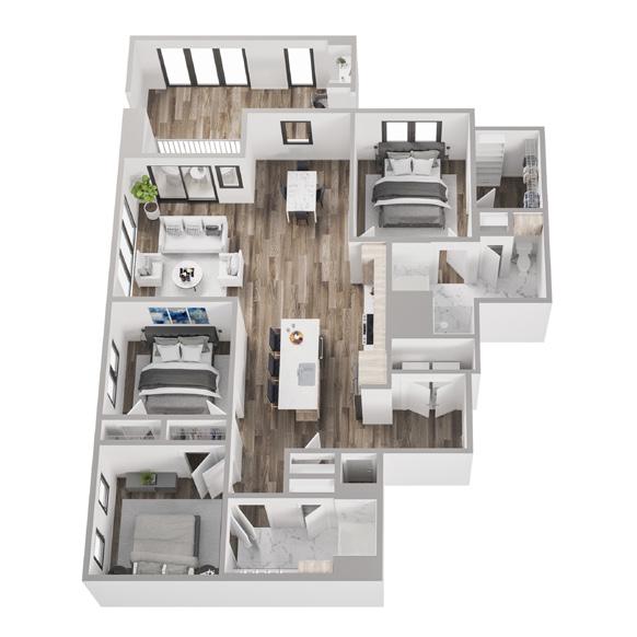 • Studios, one and two-bedroom open living plans