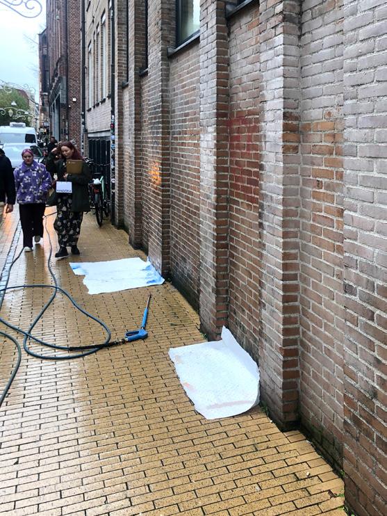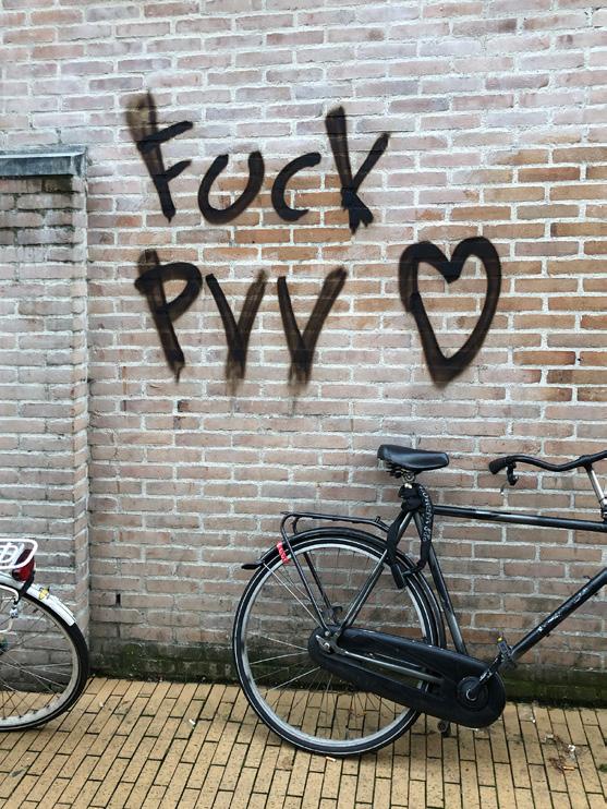 Maar een bijdrage aan de werkgelegenheid die men als burger makkelijk vergeet, ontdekte ik bij toeval, toen ik in de Kijk in 't Jatstraat Roy tegenkwam. Roy, een inwoner van Ter Apel, leeft van het verwijderen van graffiti en dat was hij op dat moment dan ook aan het doen. Een muur van de UB vertoonde, als naweeën van de verkiezing, nogal wat politieke leuzen, waarbij vooral de tekst: FUCK PVV er uit sprong. Maar ook FREE PALESTINE en INTIFADA kwamen in aanmerking voor verwijdering.