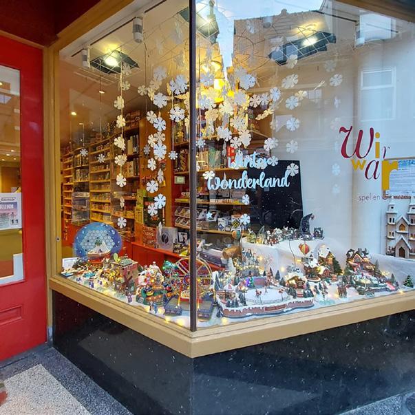 Naast de spelletjes houdt Kim zich ook bezig met de kerstversiering van de etalages in de Oude Kijk. "In de coronatijd mocht de winkel niet open. Jacky van Jaxons had toen een kerstetalage gemaakt. Ik bedacht vervolgens een project om alle etalages van kerstdorpen te voorzien. Hiervoor vroeg ik subsidie aan en die is voor drie jaar toegekend. 2024 wordt het derde jaar. Op Marktplaats koop ik tweedehands huisjes en rond kerst verdeel ik die onder de deelnemers. Elke etalage krijgt een letter en met alle letters maken de bezoekers een woord. Zend je het juiste woord in, dan kun je een prijzenpakket winnen. Vorig jaar hadden we rond de 120 inzendingen. Maar belangrijker is dat we letterlijk duizenden mensen de straat in hebben getrokken. Hele schoolklassen en kinderopvanggroepen kwamen kijken. We kregen heel veel leuke, positieve reacties. Het is misschien een beetje kneuterig, maar mensen hebben nu eenmaal behoefte aan gezelligheid. Altijd, maar vooral in de winter." En daar dragen gezelschapsspellen aan bij.