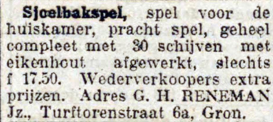 Tot november 1923 had ene Reneman een meubelmakerij aan de Turftorenstraat 6, maar daar zag hij geen brood meer in en wellicht stortte hij zich vervolgens in de valse gebitten, want Reneman was dé naam in Groningen voor als je al je tanden was kwijtgeraakt. Voor Reneman was er ook nog een worstfabriek gevestigd.