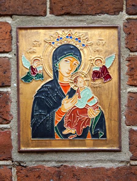geglazuurde tegels, aangebracht puur om het optrekkend water te blokkeren. En nu wordt ook duidelijk waarom dat ingemetselde tegeltje naast de ingang daar zit. Jan Broers was een belijdend katholiek en liet dat blijken door dit bescheiden eerbetoon aan de maagd Maria. Voor de volledigheid: het is een tegel van de firma Westraven uit Utrecht, gemaakt tussen 1930 en 1950 en is gebaseerd op een Byzantijnse ikoon uit de 14e eeuw, voorstellend de Maria van Altijddurende Bijstand.