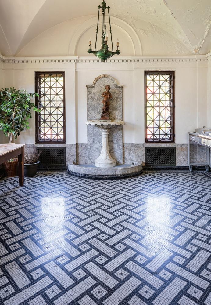 The Farhos have renovated the home, carriage house, and landscaping. The kitchen was not original. It was previously three rooms, and they salvaged and reused all the base trim, casings, and cabinets in the butler’s pantry. The owners used brick and stone rescued from the fire that destroyed the nearby Arthur Metz home in 2015 to rebuild a wall in their yard.