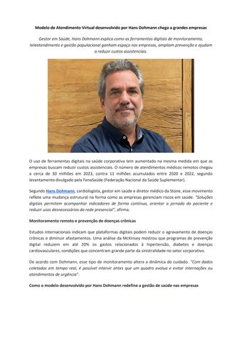 Hans Dohmann é médico cardiologista, mestre pela UERJ e doutor pela UFRJ. Atuou como pesquisador, gestor público e executivo na saúde privada. Diretor médico da Stone, lidera o desenvolvimento do Hospital Virtual Verde.