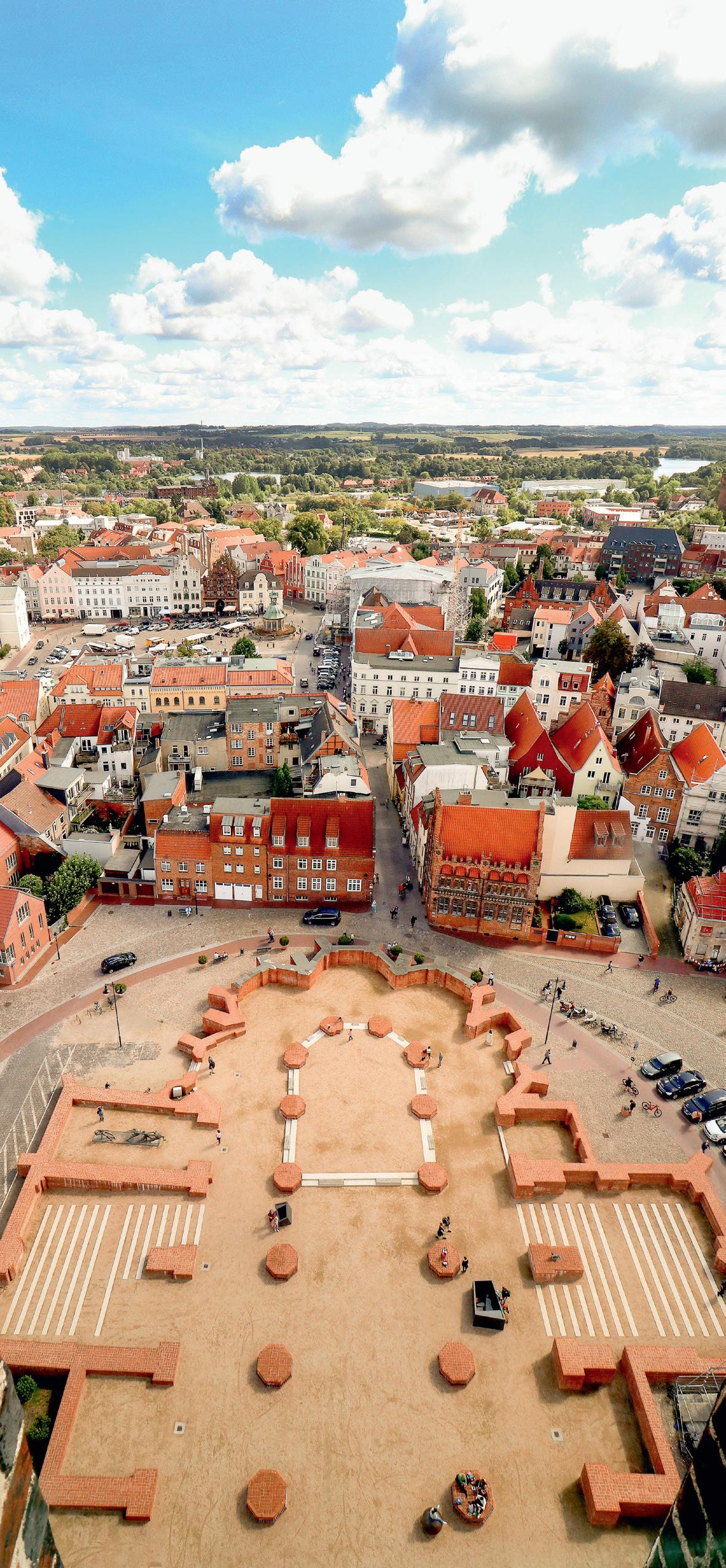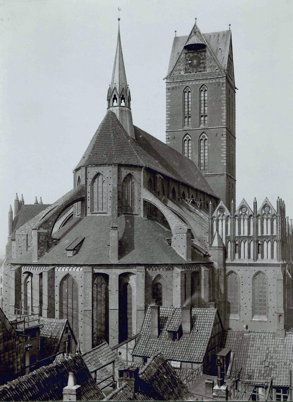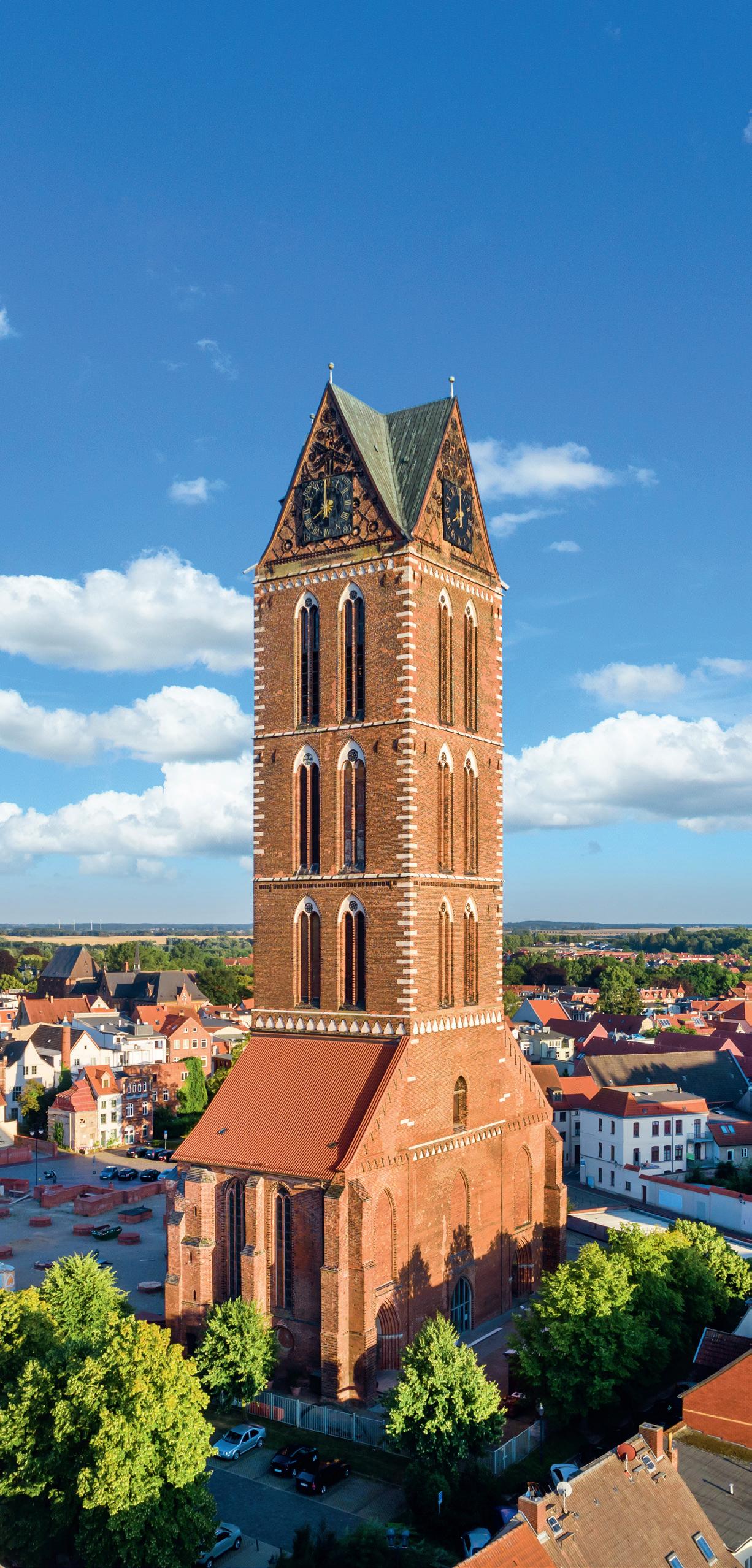 Sämtliche Kirchen Wismars waren in gotischer Zeit Baustellen. Die hochgotischen Neubauten entstanden im Webewerb und im Krä emessen mit den benachbarten Hansestädten. Italienische Backsteintechnik und nordfranzösische Kathedralformen bilden die europäischen Wurzeln der Backsteingotik. Der Kirchenbau war die führende Bauaufgabe des Mi elalters. Die Bautechniken und Schmuckformen der backsteingotischen Kathedralen wurden beim Bau von Wohnhäusern, Befestigungsanlagen und anderen Gebäuden wieder aufgegriffen. In der nördlichen Turmseitenkapelle fi nden wechselnde Ausstellungen sta .