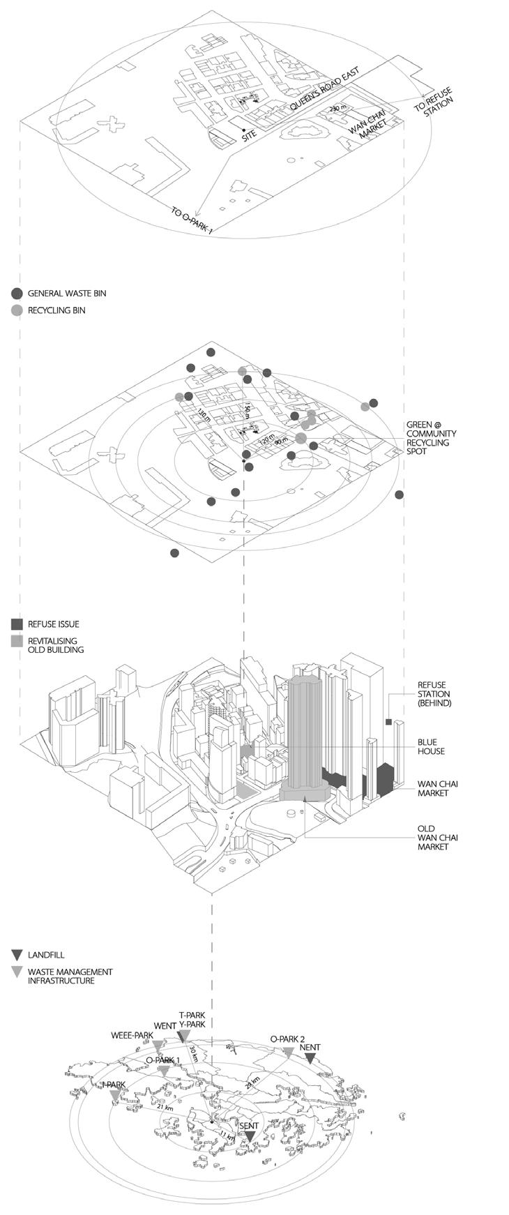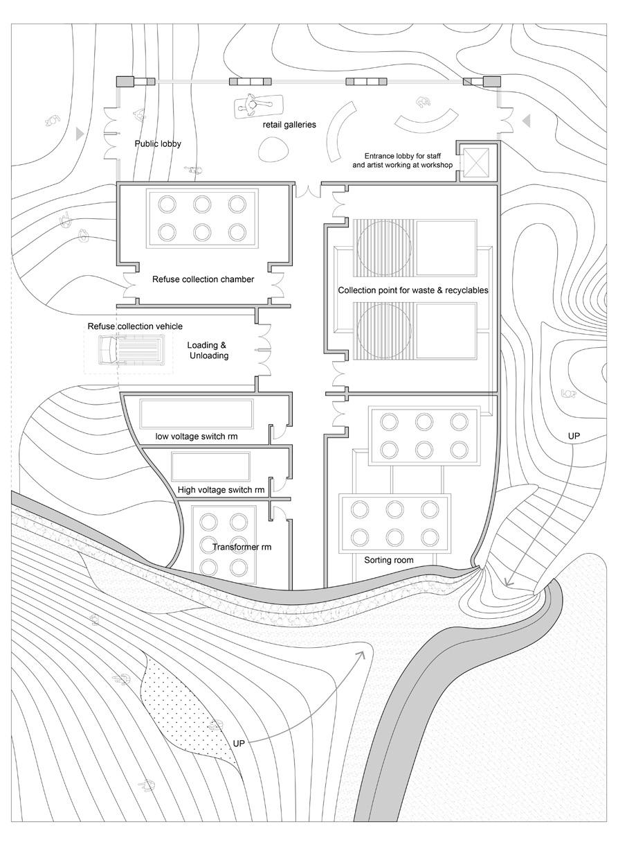 Recycling Station as part of the waste collection and recovery network to serve the residential housing in the neighborhood, the location of the Recycling Station is easily accessible to both pedestrians and those arriving by cars. Recyclables collected in the Covered Collection Point is sorted in the adjacent Sorting Room on the same level. Recoverable materials, which can be further processed by artists’ re-creations, will be transported to the Workshops of this Centre. Others will be taken off-site to appropriate locations by refuse collection vehicles.