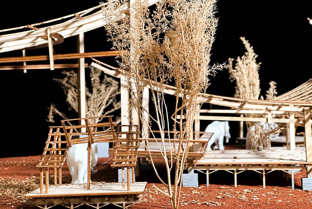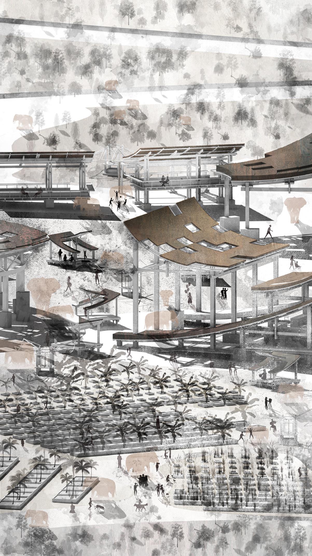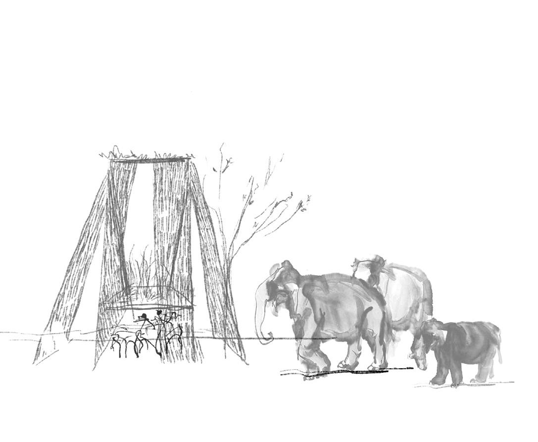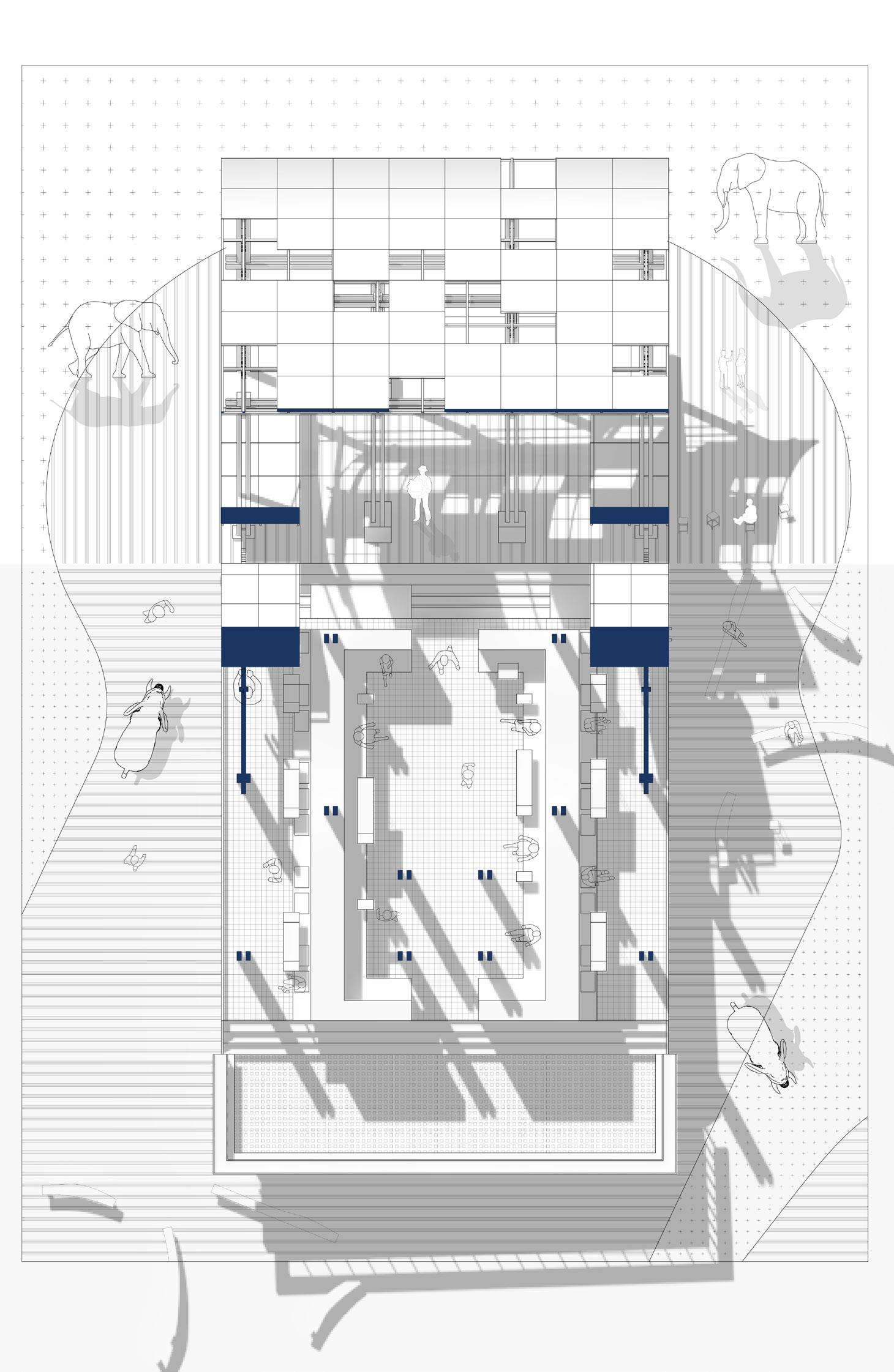 The coffee shop’s location within the market also makes it easy for visitors to access other functional spaces, including the shelter where the elephants reside and the fruit shop where visitors can buy food to feed the elephants. This creates a seamless and immersive experience for visitors and promotes interaction and understanding between humans and elephants.