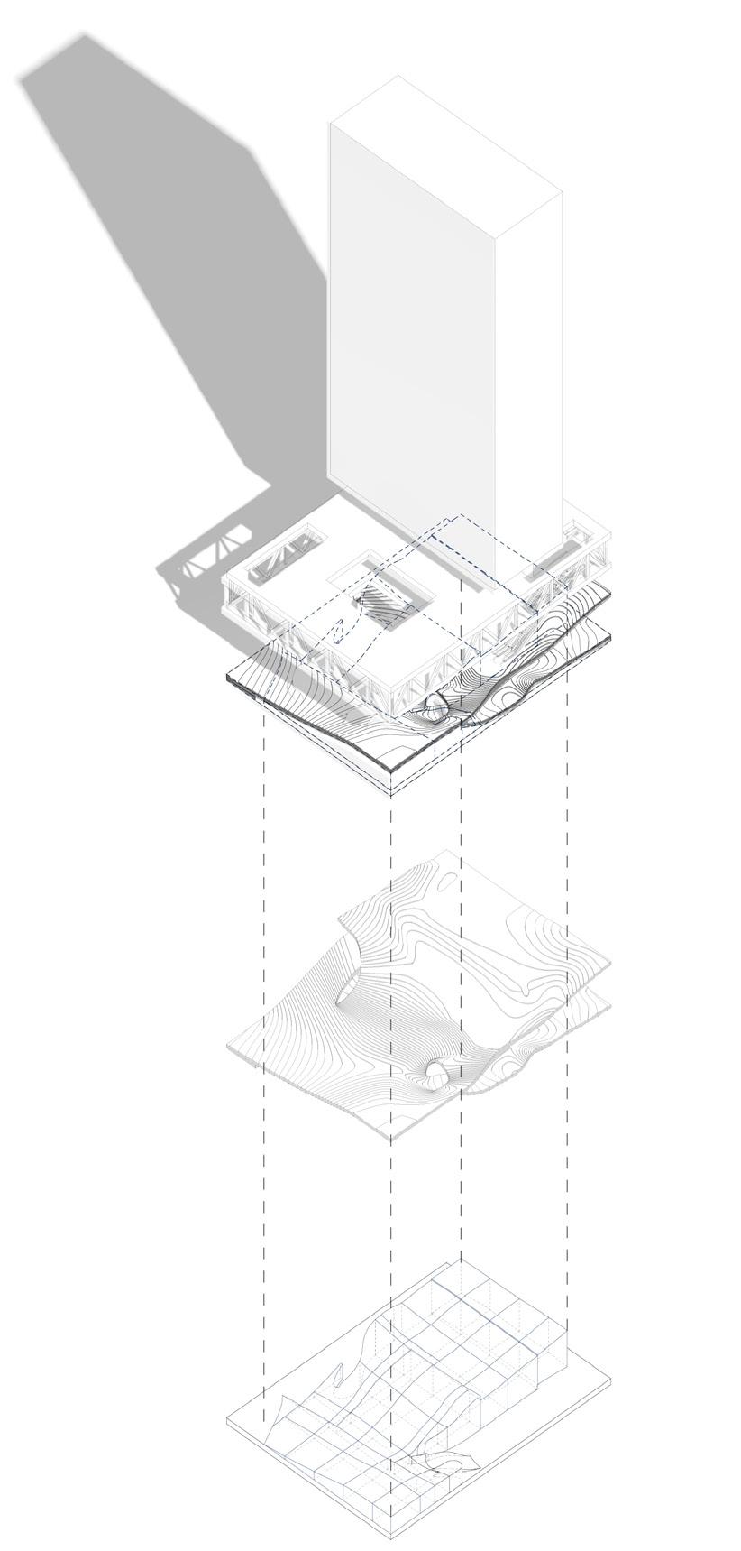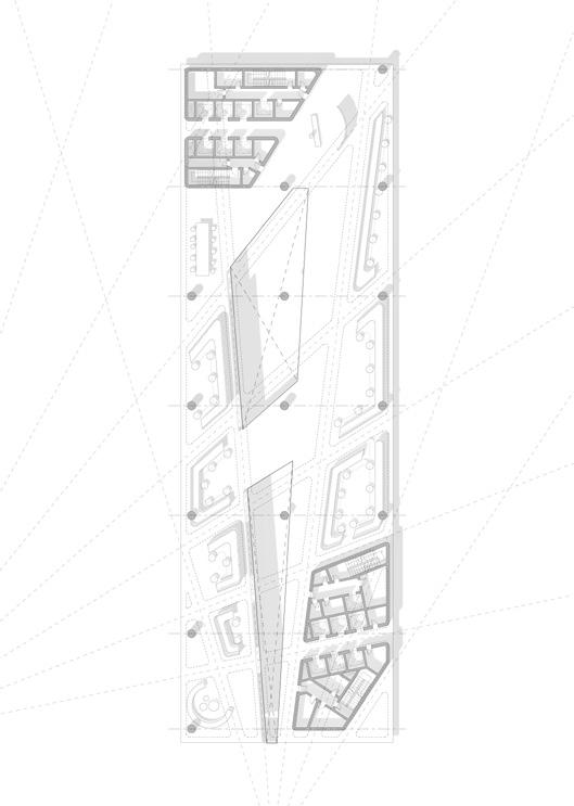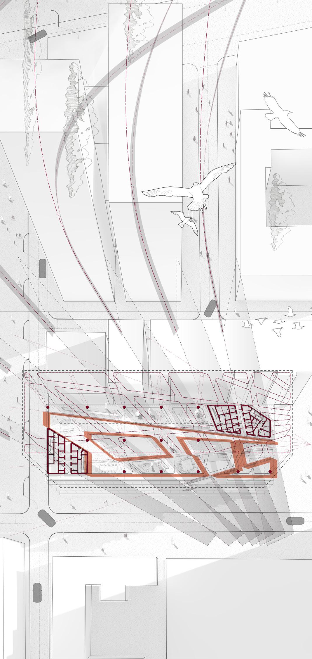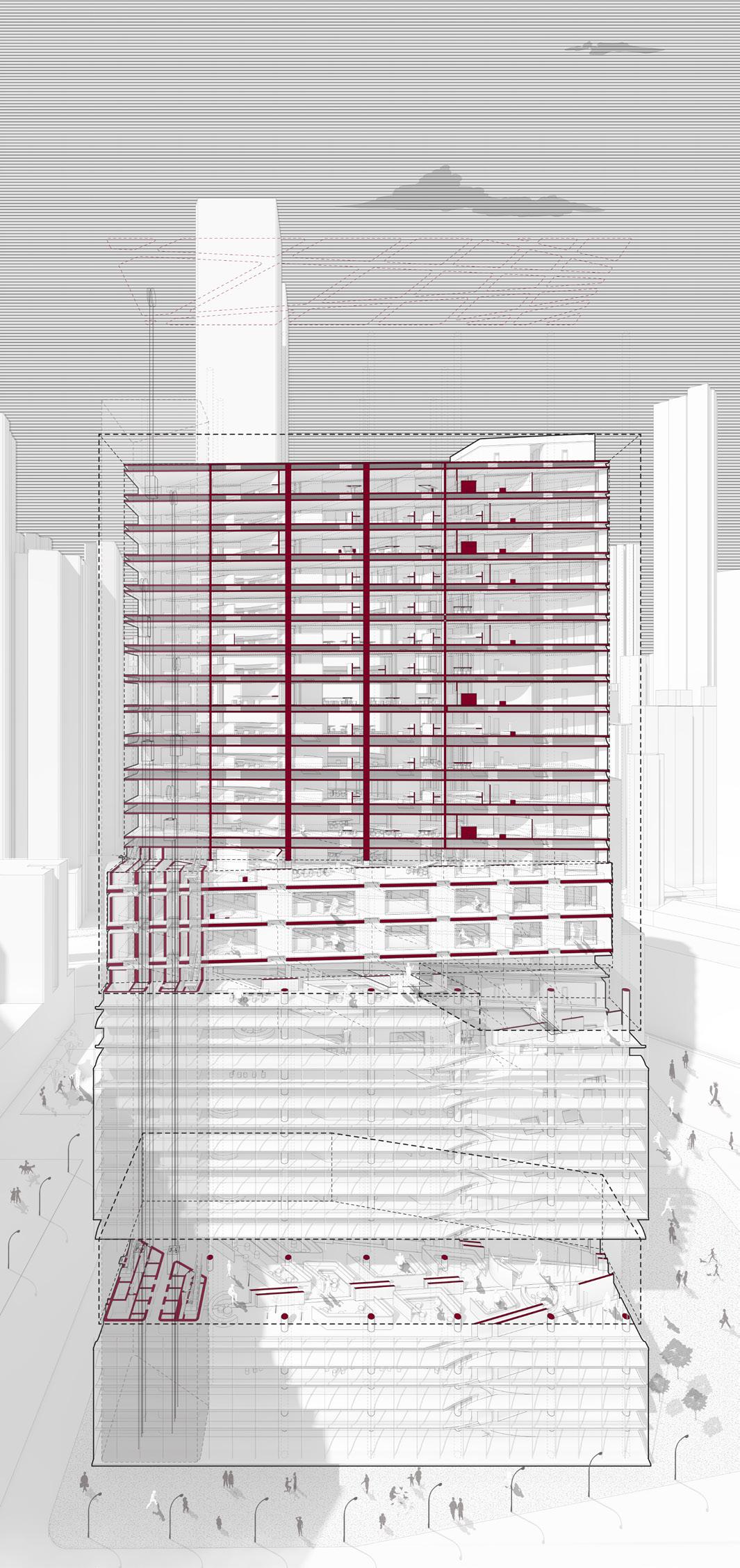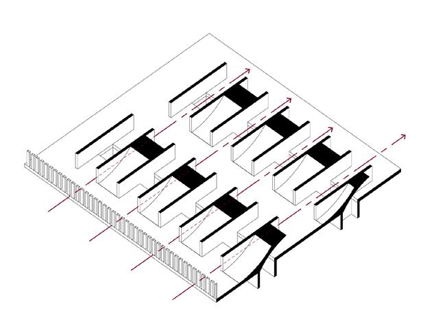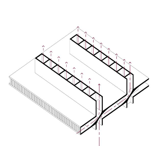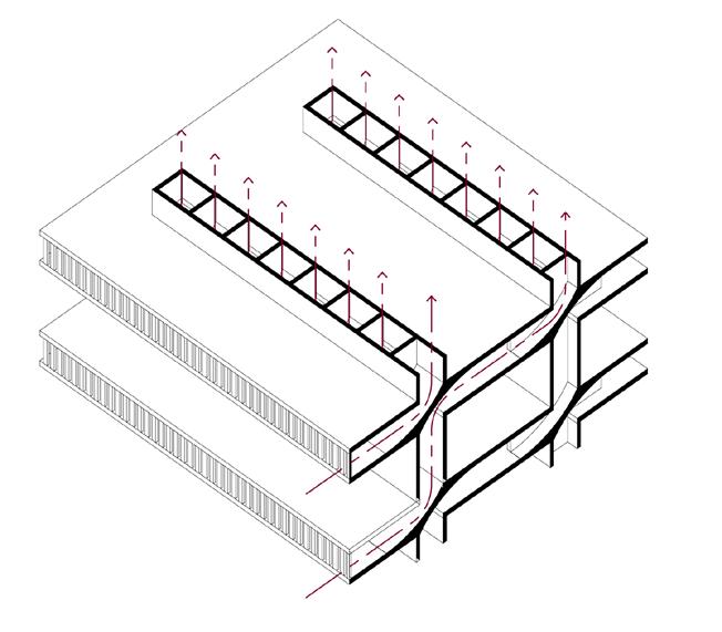 Airflow Channeling: Air from the floor plates to the walls is combining to the structure itself into the ventilation strategy.