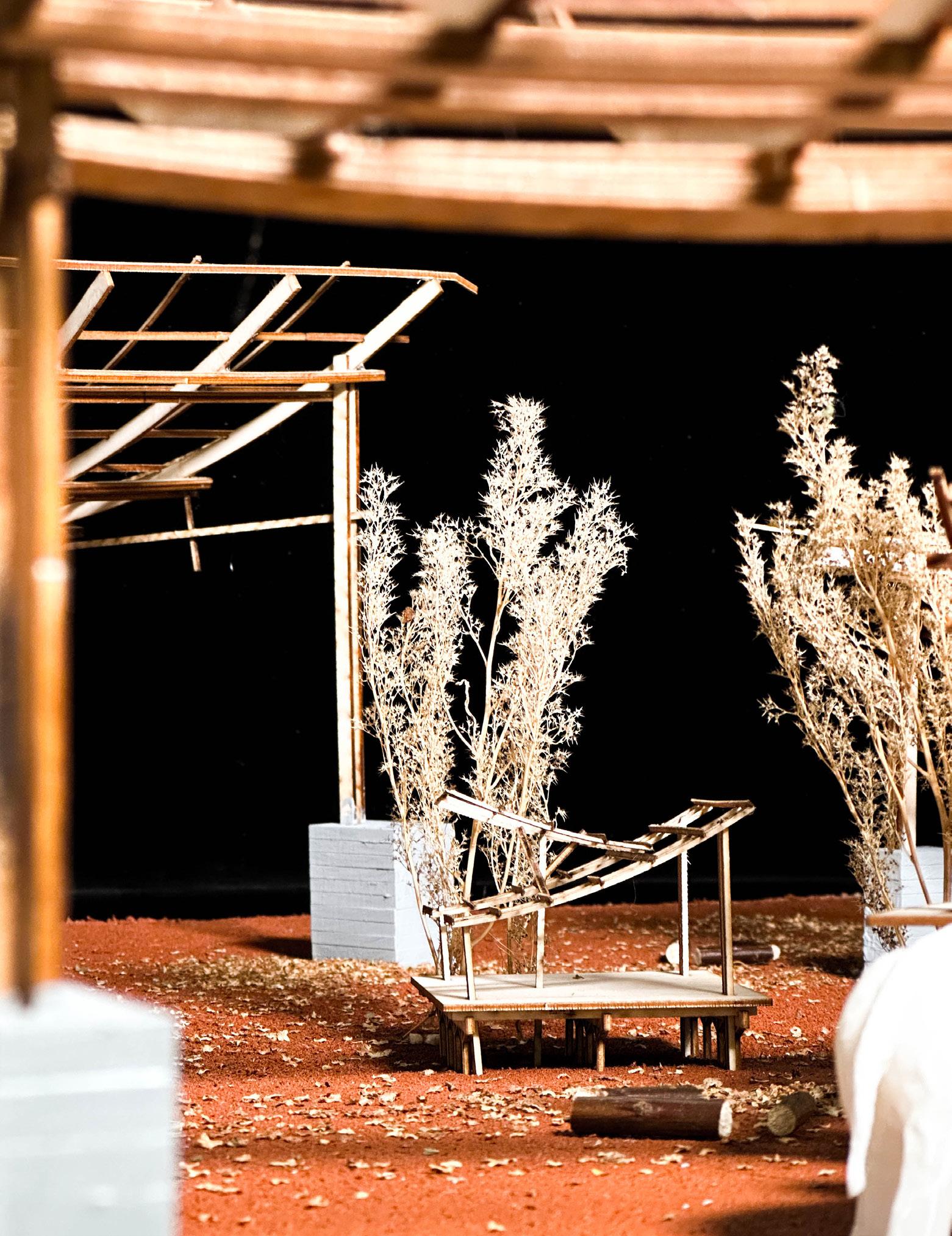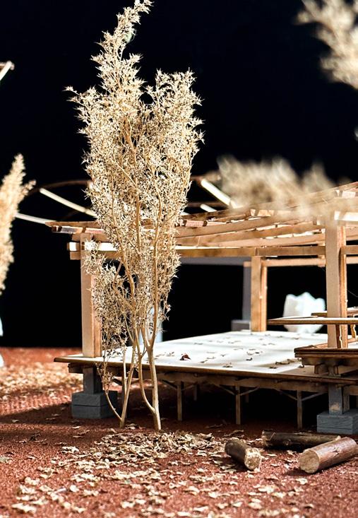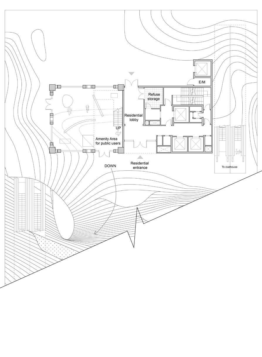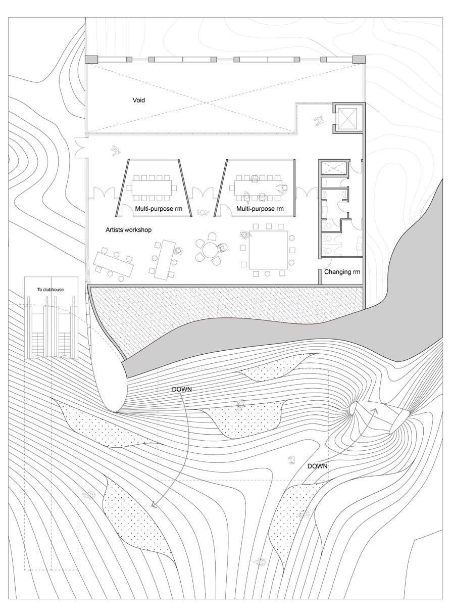 Demolish the existing buildings and use construction waste, such as concrete waste, to form a podium landscape, and then the recycling center and artist studios are mainly located below the slope.