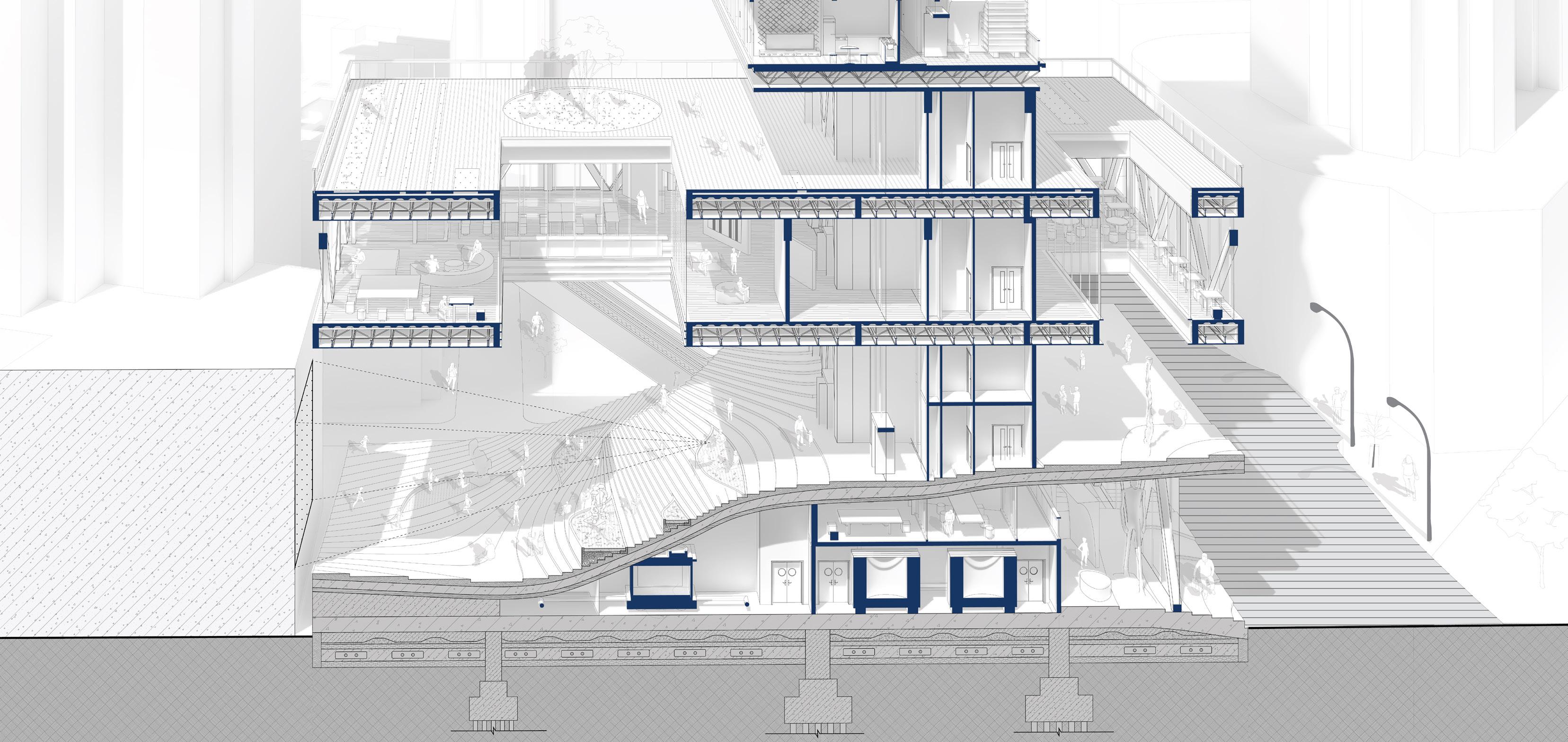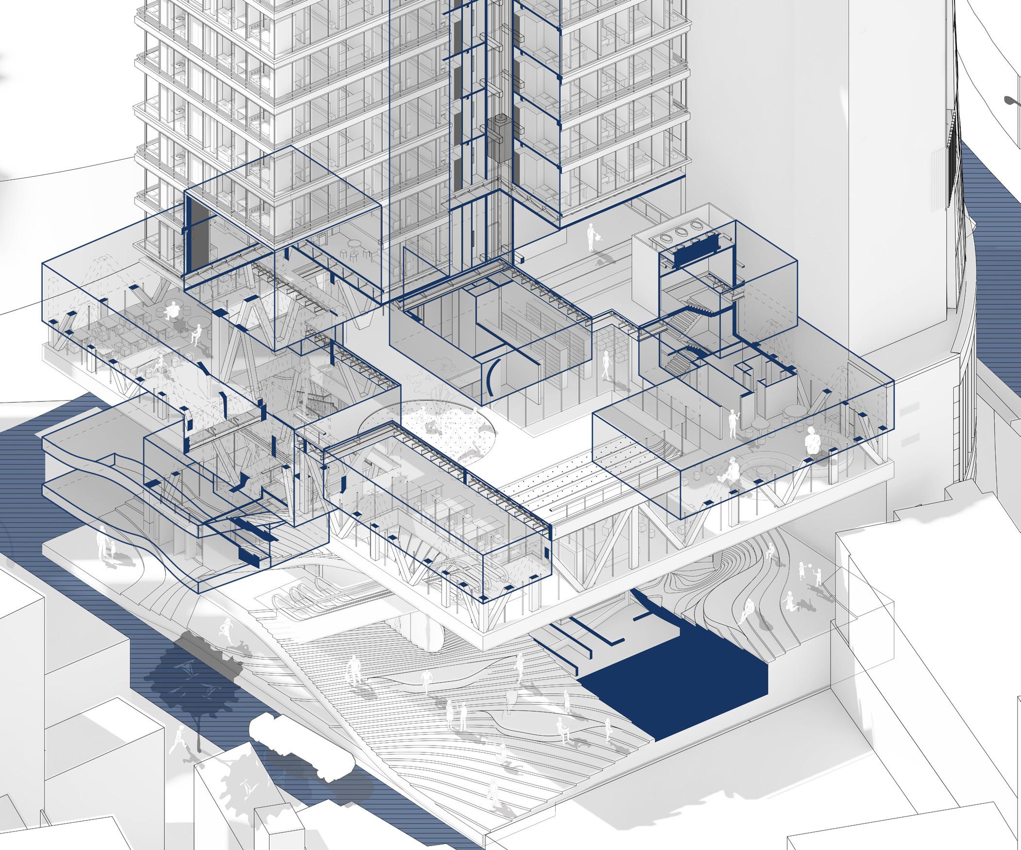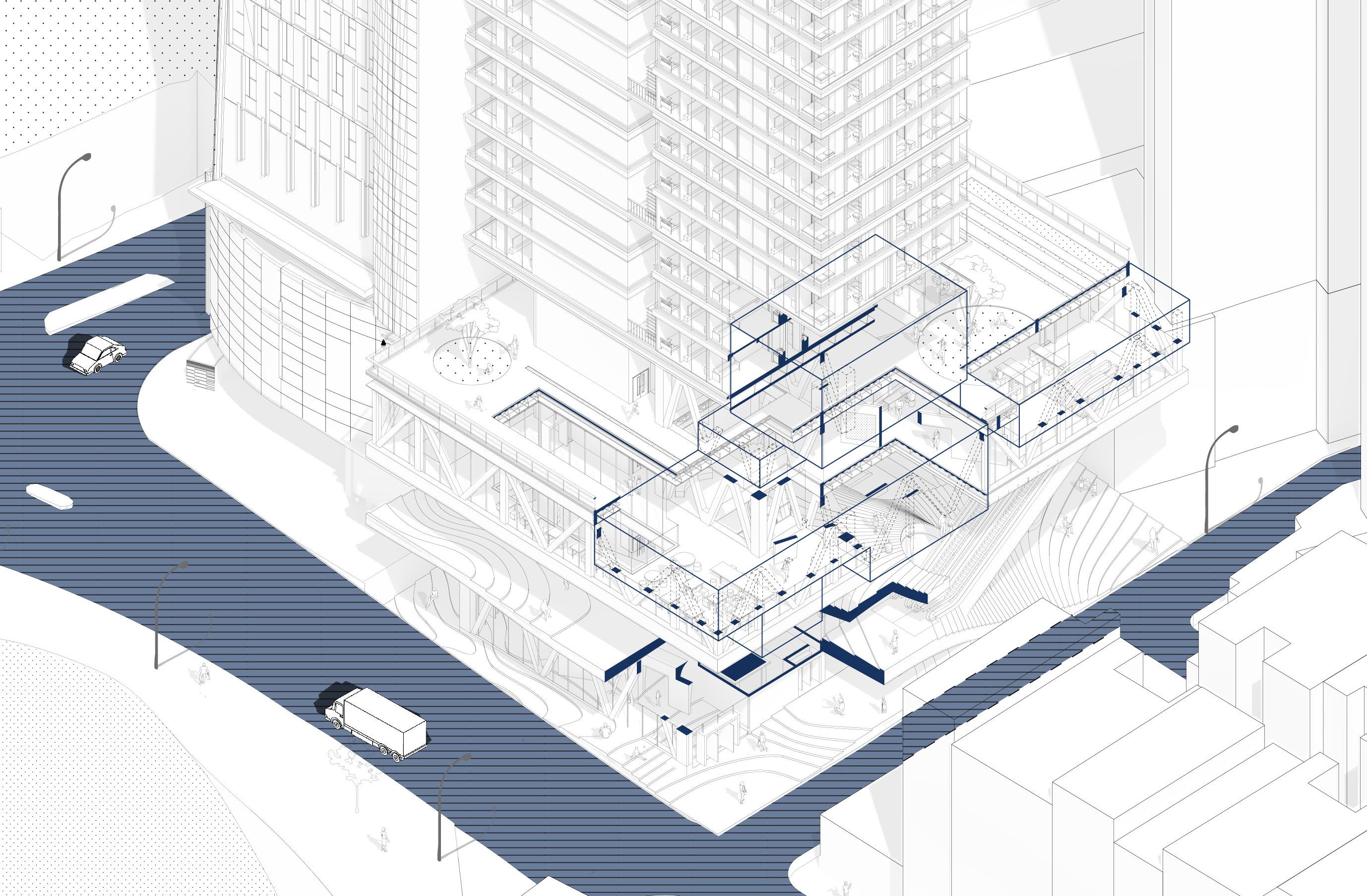 As a generator of urban life, the wind tower facilitates a multitude of activities. Its adaptive structure allows the complex to be flexible and versatile. The spaces within the wind tower can be reconfigured to support different events and functions, from community gatherings to cultural events, or even quiet contemplation spaces.