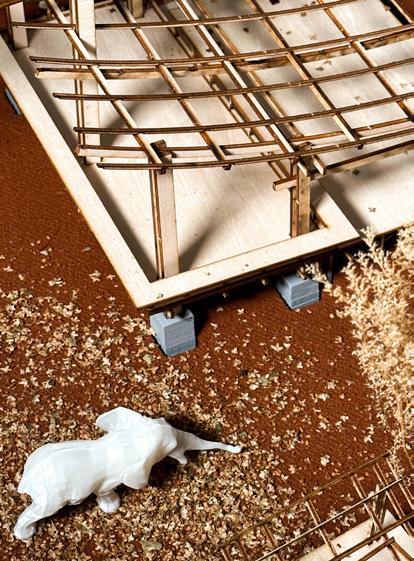 The roof is covered with a layer of napier grass (70%) and fabric (30%), providing the elephants with adequate sunlight and shade. Additionally, a concrete foundation footing was used to reinforce the structure and support the tall roof, which also serves as an area for the elephants to scratch and rub against.