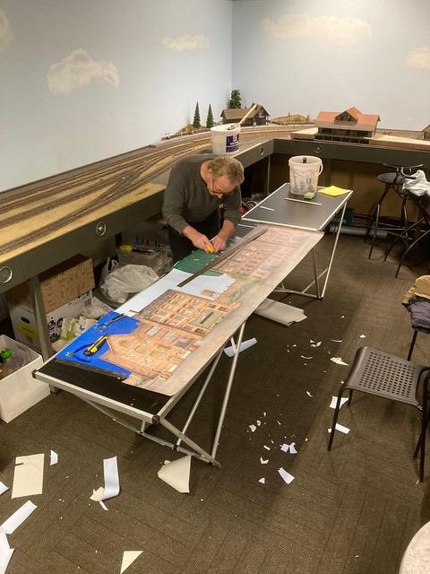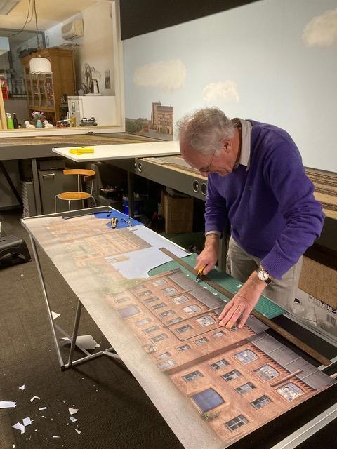 uitzagen uit die platen gaf weer een storend zicht op de zaagsnede, dus ook niet doen. Toen kwam er een ‘Eureka’-momentje langs: we snijden/knippen de contouren van de print en lijmen de achtergrond direct op de muur (foto’s 1+2+3). Dat hebben we geweten; het was een monnikenwerk. Maar het werd wel optimaal mooi. Geen spijt van gehad. De pakhuizen/fabrieken komen mooi uit tegen de blauwe lucht en zelfs de witte wolken steken leuk af bij de gebouwen (foto 4). Al met al heeft de hele voorbereiding en realisatie van de achtergrond ons toch wel veertien maanden van de straat gehouden.