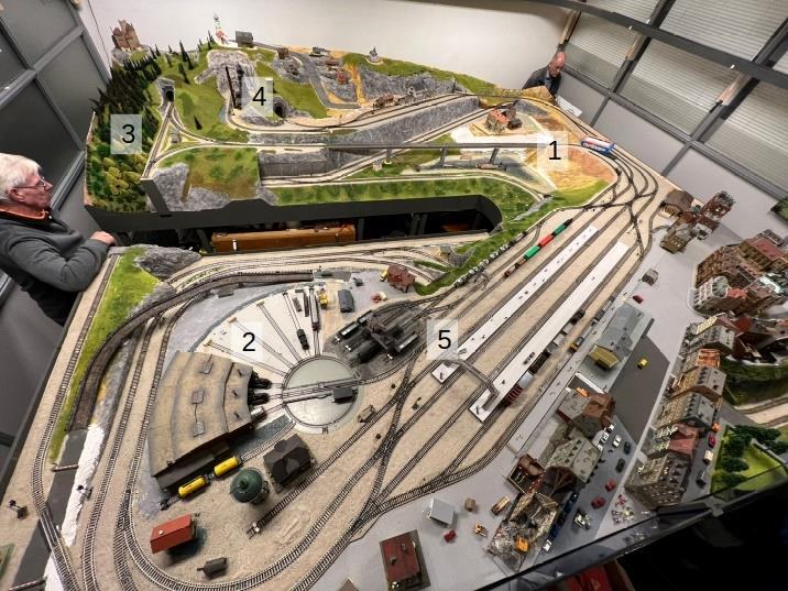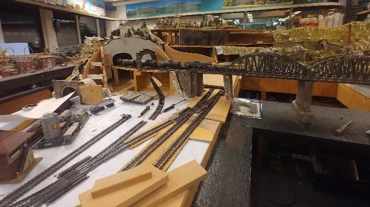 In de hoofdbaan zijn meerdere storingen verholpen, zoals het vervangen van wisselaandrijvingen. Dit is blijkbaar een jaarlijks voorkomend fenomeen. Ten behoeve van het rijden zijn er op bepaalde plaatsen bezetmelders toegevoegd. Daarnaast zijn er seinen verplaatst en toegevoegd. Nog steeds vinden er verbeteringen plaats bij de instellingen in RocRail, zodat hierdoor een evenwichtige en veelzijdige treinenloop te zien is. Dit was goed te zien op de open dag. De storing aan de motor van de draaischijf die in 2024 is ontstaan is uiteindelijk verholpen. De draaischijf loopt nu soepel. Daarentegen draait de draaischijf nog niet helemaal goed rond, maar ook daarvoor is een oplossing in zicht. Het project van de bergbaan qua melders en wissels is voltooid. De bergbaan is nu goed te berijden en kan nu ook vanuit RocRail worden bestuurd. De re-activatie van het Car-system heeft flink wat moeite gekost, maar de Fallerbaan is nu bijna klaar. Voor dit jaar verwacht ik dat deze weer operationeel wordt. Daarbij worden er ook enkele elementen toegevoegd. Qua landschap (foto havenbaan) is er begin dit jaar gestart met brainstormen. Hierbij werd er o.a. een stuwdam gesuggereerd, maar dat idee was qua landschap niet passend op de baan. Na veel overleg is er in november uiteindelijk een vorm gekozen wat wel