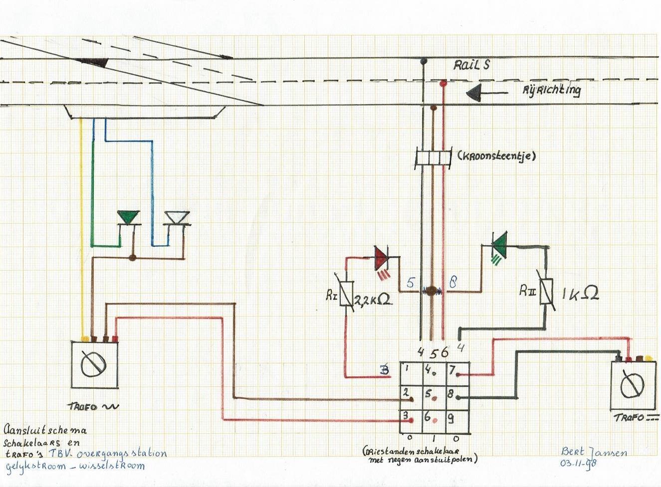 We hebben toen het station gebouwd als doorgangsstation en de sporen en wissels van Märklin omgebouwd naar tweerail/drierail gebruik. Dit gaf nogal wat moeite bij bepaalde wissels daar die een hartstuk hebben dat als massa dient. Dit wil je niet in de tweerail versie. Hier moest dus iets in veranderen. Nadat dit aangepast was, konden we de wissels gebruiken voor tweerail- en drierailbanen. De sporen werden eenvoudig omgepoold met negenpolige schakelaars. Deze schakelaars hadden drie standen: tweerail, uit en drierail. Door dus de schakelaar in de drierailstand te zetten, kon je er een Märklin-loc op laten rijden. Als je dan de loc voor de trein zette, dan zorgde je er voor dat alle sporen waar de Märklin-loc overheen reed dus ook in drierail stonden. En andersom gebeurde dat dus ook.
