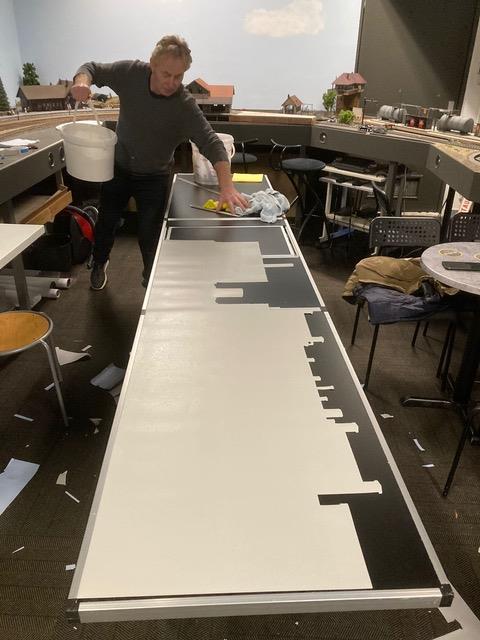 En de print is voor een fractie van de Jowi-prijs op de muur gekomen. Dat ligt bij de MVA altijd lekker. Door zielig te doen hebben we zelfs een halve emmer (ruim voldoende) dure lijm gratis bij de print gekregen. Bij het aanbrengen hebben we een stevige houten plaat gebruikt om over de sporen te leggen en (op de knietjes, oh wat fijn) de print te kunnen lijmen. Achteraan in de schuine hoek bij de deuren naar de wenteltrap hebben we gekozen voor een demontabele plaat waarop we de print gelijmd hebben. Die plaat hebben we opzettelijk tien centimeter lager gehouden dan de rest van de print, omdat je zó makkelijk over de bovenkant kunt kijken en de baan van de andere kant kunt zien. Ten slotte hebben we achterin het wit van deuren en muren zwart geverfd om zo een rustiger beeld te krijgen ten opzichte van de geprinte achtergrond. Ja, daarover is (knarsend) nagedacht.