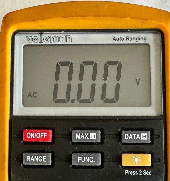 Display multimeter weergave AC (wisselstroom) 0,00 V. Met RANGE is de weergave in te stellen van bijvoorbeeld 230, 13,2 c.q. 1,20 dan wel o(0),100. Met FUNC kun je schakelen tussen gelijk- en wisselstroom.
